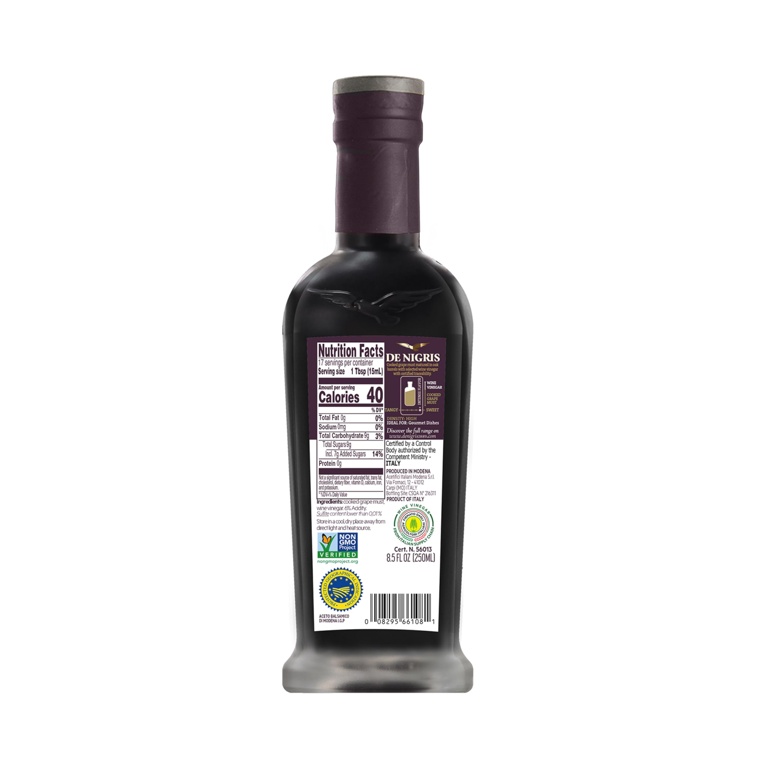 This authentic high density balsamic vinegar of Modena pg.. Contains 65% percent grape must, making it one of the highest qualities available on the market. It is sweet and thicker than your average balsamic. The de nigari's family has been perfecting the art of vinegar making since 1889 in Modena, Italy.
