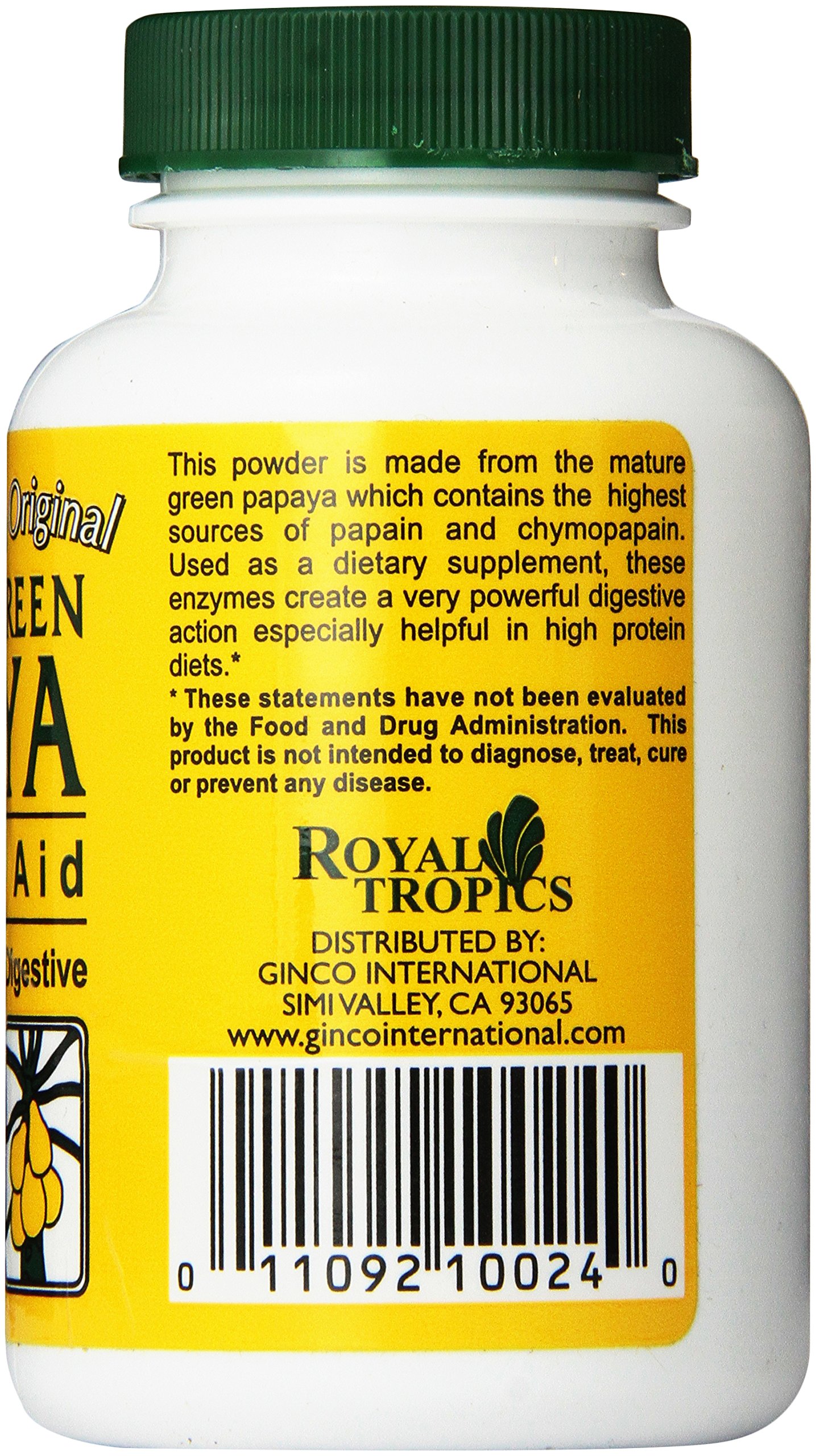 Royal tropics the original green papaya digestive aid. Description: digestive aid-maintains maximum digestive action naturally-100% pure. This powder is made from the mature green papaya which contains the highest sources of papain and chymopapain. Used as a dietary supplement, these enzymes create a very powerful digestive action especially helpful in high protein diets. Our green papaya powder is dried at a low temperature in order to retain the highest level of enzymatic activity, the most prevalent of which is papain. These statements have not been evaluated by the FDA. These products are not intended to diagnose, treat, cure, or prevent any disease.