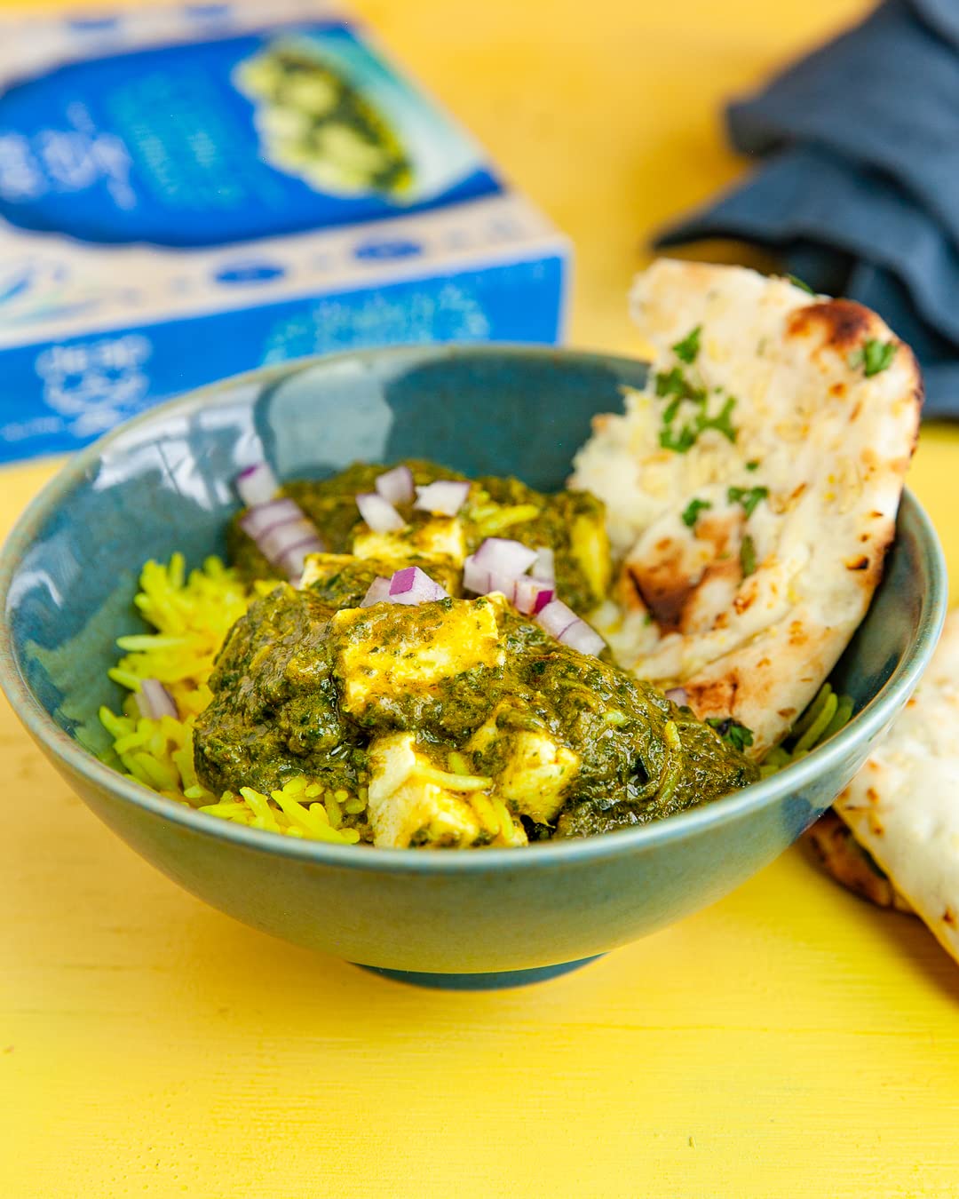 Here in our kitchen we make Spinach Paneer from scratch by finely chopping fresh spinach (palak) and cooking it down with a zesty blend of ginger, garlic and other delicious spices. We add savory pieces of our homestyle paneer (cheese) and turmeric rice. We find it is best served with a cheesy joke. Get it?