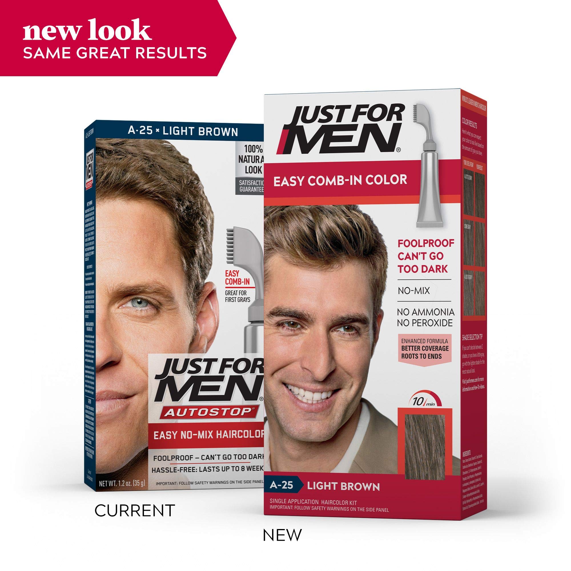 Easy: Comb in applicator allows for controlled application to where the gray is: certain areas or all over. Shuts off: Shuts itself off so it can't go too dark. Always looks natural. No mix, no mess: Just comb in, shampoo out. Takes only 10 minutes. Gentle: No peroxide. No ammonia. Leaves hair feeling soft and manageable. Long lasting: Permanent gray coverage. Lasts up to 8 weeks until the gray grows back. Picking your shade is easy. The amount of gray you have guides which shade is best for you. If your natural hair color is: Light brown with a lot of gray, this shade is right for you. If you have little to moderate gray, a lighter shade may give a better result.