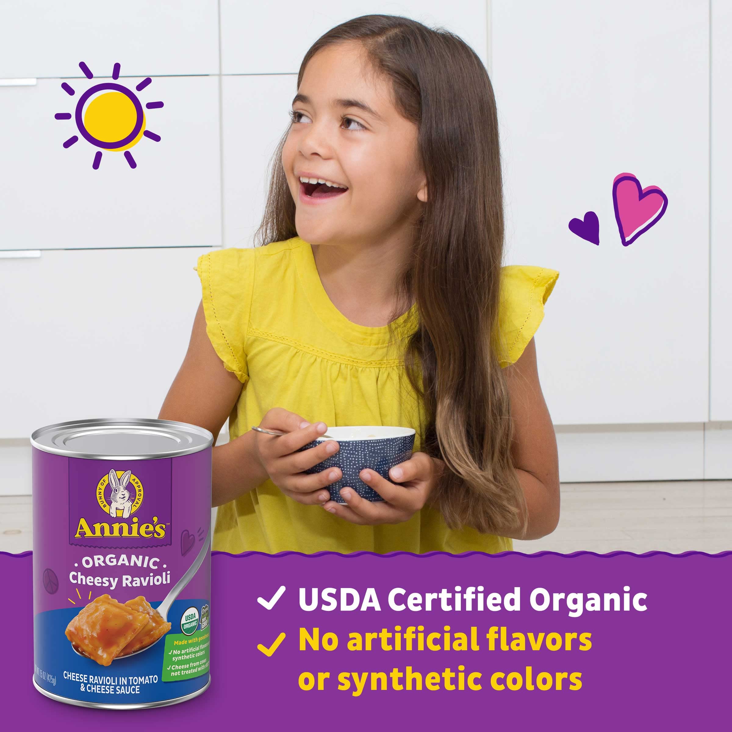 Warm, cheesy, and oh-so delicious! Annie's Organic Cheesy Ravioli in Tomato and Cheese Sauce is part of a rich and tasty meal that's ready in minutes. Simply heat in a saucepan on the stove or heat in the microwave according to the directions on the packaging. Carefully crafted using non-GMO ingredients, this Annie's canned food is made with cheese from cows raised without antibiotics or synthetic hormones, so you can feel good about serving it to the whole family. And like all Annie's organic food, it's made with goodness. That means no artificial flavors or synthetic colors. No significant difference has been shown between milk derived from rBST-treated and non rBST-treated cows. Annie's makes products in over 20 family-friendly categories — from fruit-flavored snacks and cereal to mac & cheese. For busy bunnies and families on the go, we help make life a little easier and more delicious by sweetening up packed lunches or by adding to a savory, yummy dinner. Annie’s is devoted to spreading goodness through nourishing, tasty foods and kindness to the planet.