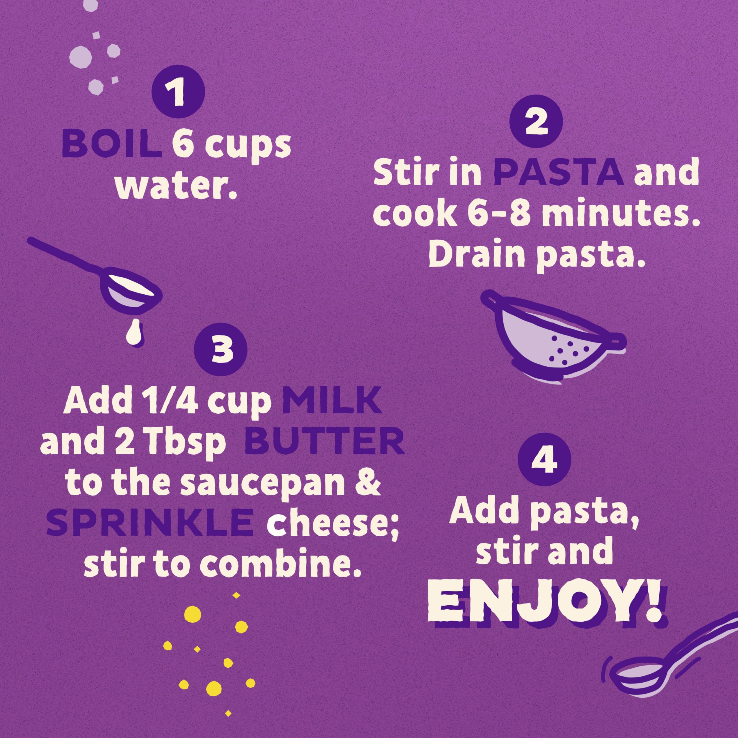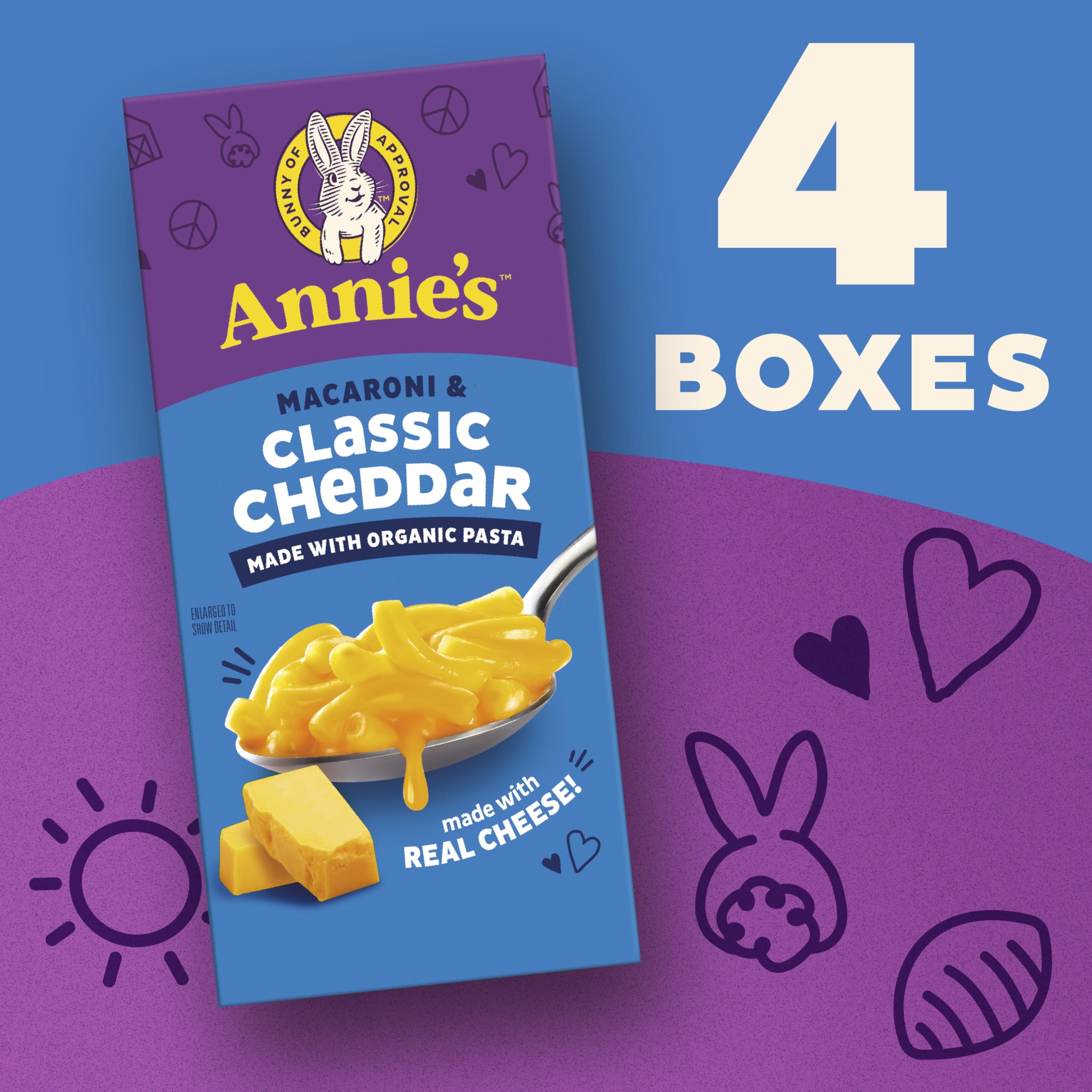 Get yum on the table in about eight minutes with Annie's Macaroni and Classic Cheddar. Kids will love the creamy taste of classic cheddar cheese in their favorite comfort food. Parents will love having a convenient snack, or a tasty part of lunch or dinner that's packed with goodness. Serve a portion paired with chicken nuggets. Try some as a side dish to any meal. Whip up a warm bowl of deliciousness as an after school snack. The tasty possibilities are endless! About nine servings per container. Annie's makes products in over 20 family-friendly categories, from fruit flavored snacks and cereal to mac and cheese. For busy bunnies and families on the go, we help make life a little easier and more delicious by spreading goodness through tasty foods and kindness to the planet. Contains one 24 oz pack of Annie's Macaroni and Classic Cheddar, Made with Organic Pasta and Real Cheese; Four 6 oz boxes; shelf-stable dried mix.