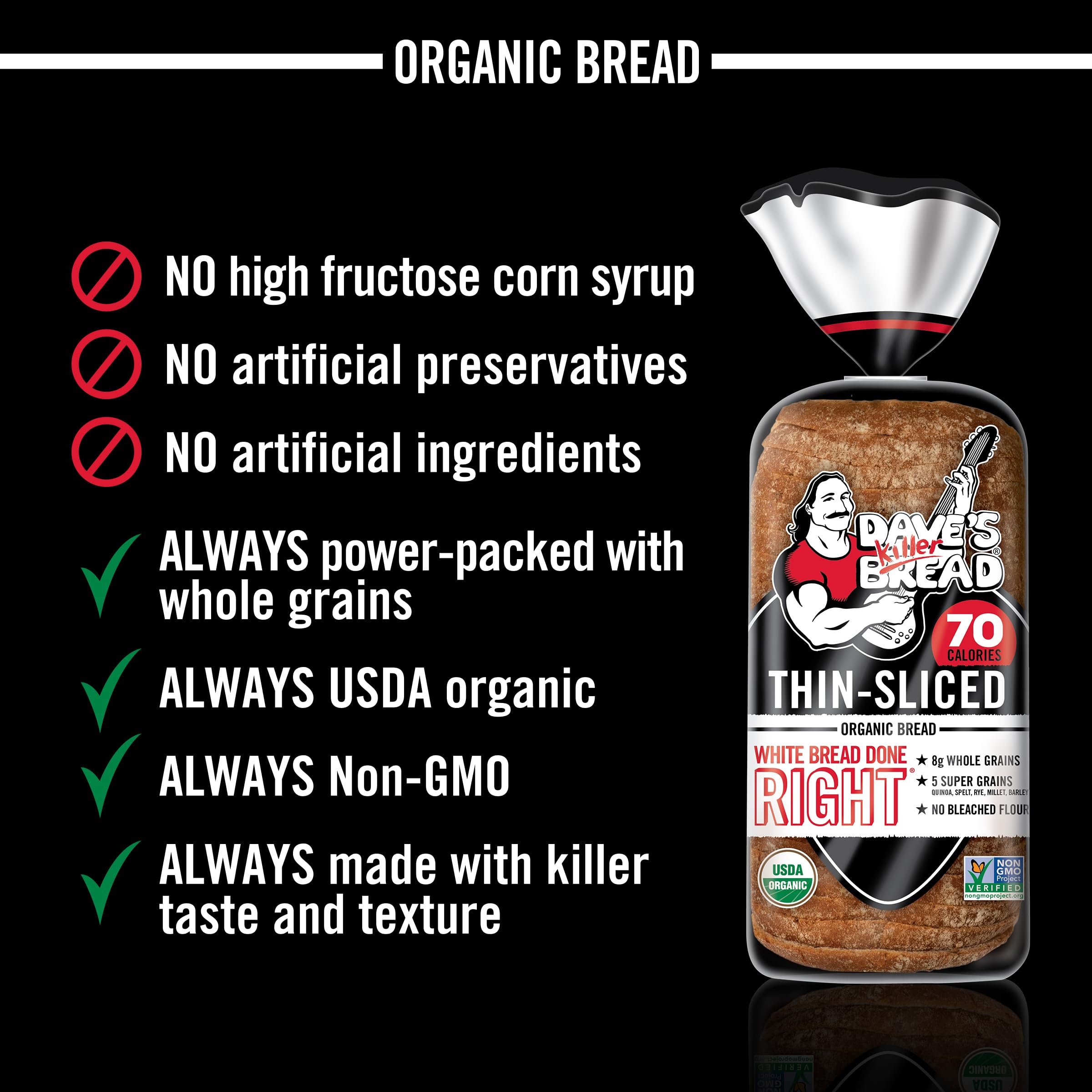 Dave's Killer Bread® White Bread Done Right® Thin-Sliced bread loaf is our take on sliced white bread, featuring killer taste, an artisan-style texture and no bleached flour. It has the smooth, soft texture of regular White Bread Done Right®, but in thin-sliced form with 70 calories and 8g of whole grains per slice. This USDA organic white bread is perfect for killer grilled cheeses or rich French toast. This soft and smooth artisan-style bread features five super grains: quinoa, spelt, rye, millet and barley—not to mention no high-fructose corn syrup, no artificial preservatives and no artificial ingredients. You can trust Dave's Killer Bread® to deliver killer taste, texture and always be Non-GMO Project Verified. White Bread Done Right® Thin-Sliced is just what you need for killer club sandwiches and fluffy PB&Js. For soft and smooth white bread, try Dave's Killer Bread® White Bread Done Right® Thin-Sliced.