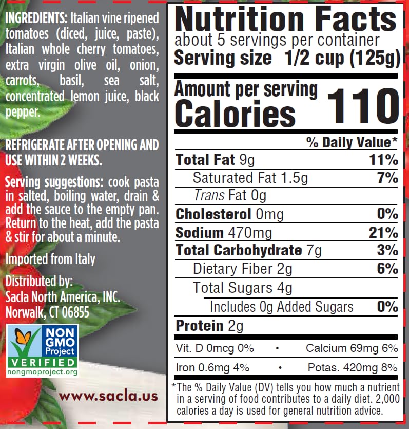 SACLA Cherry Tomato & Basil Pasta Sauce with No Added Sugar | 100% Italian Grown Tomatoes with Basil & Extra Virgin Olive Oil | 24 oz Glass Jar | Imported from Italy | Non-GMO Authentic Italian Sauce