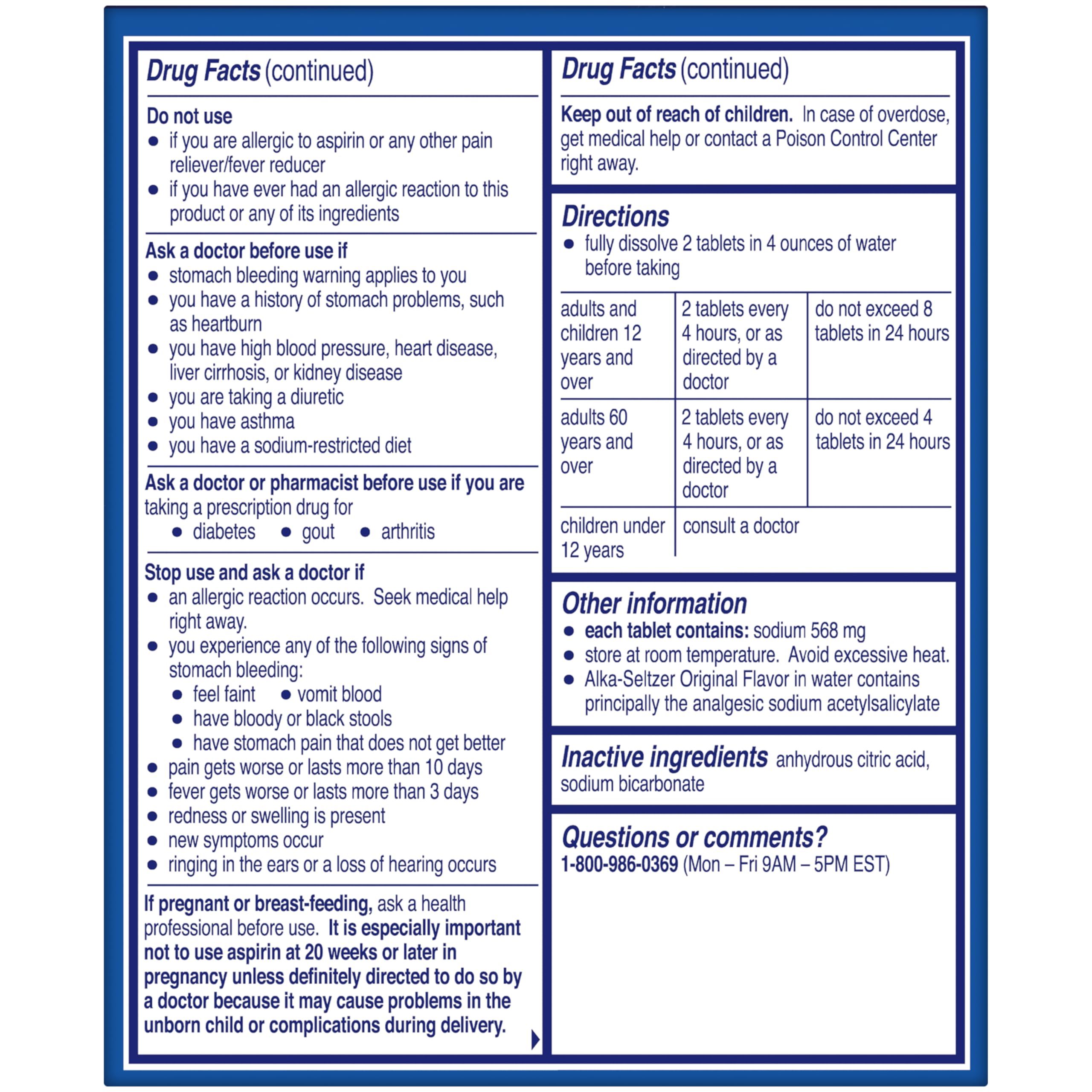 From a trusted brand for over 90 years, Alka-Seltzer Original Flavor Effervescent Tablets provide fast, fizzy, refreshing relief. Our iconic original effervescent relief tablets quickly dissolve in water to bring you fast, powerful relief where, and when, you need it most. Alka-Seltzer fizzy tablets provide a fizzy format to bring you multi-symptom relief of headache, backache, body ache, and muscle pain so you can say yes to life. With the active ingredient buffered aspirin, just 2 effervescent tablets dissolved in water bring you fizzy relief. Alka-Seltzer Original Flavor multi symptom tablets make for fast, convenient, portable relief— from the pantry, to the glove compartment, to your pocket. To use, fully dissolve tablets in 4 ounces of water before taking. Adults and children over 12 years old can take 2 tablets every 4 hours as needed, or as directed by a doctor. Do not exceed 8 tablets in 24 hours. Adults 60+ do not exceed 4 tablets in 24 hours