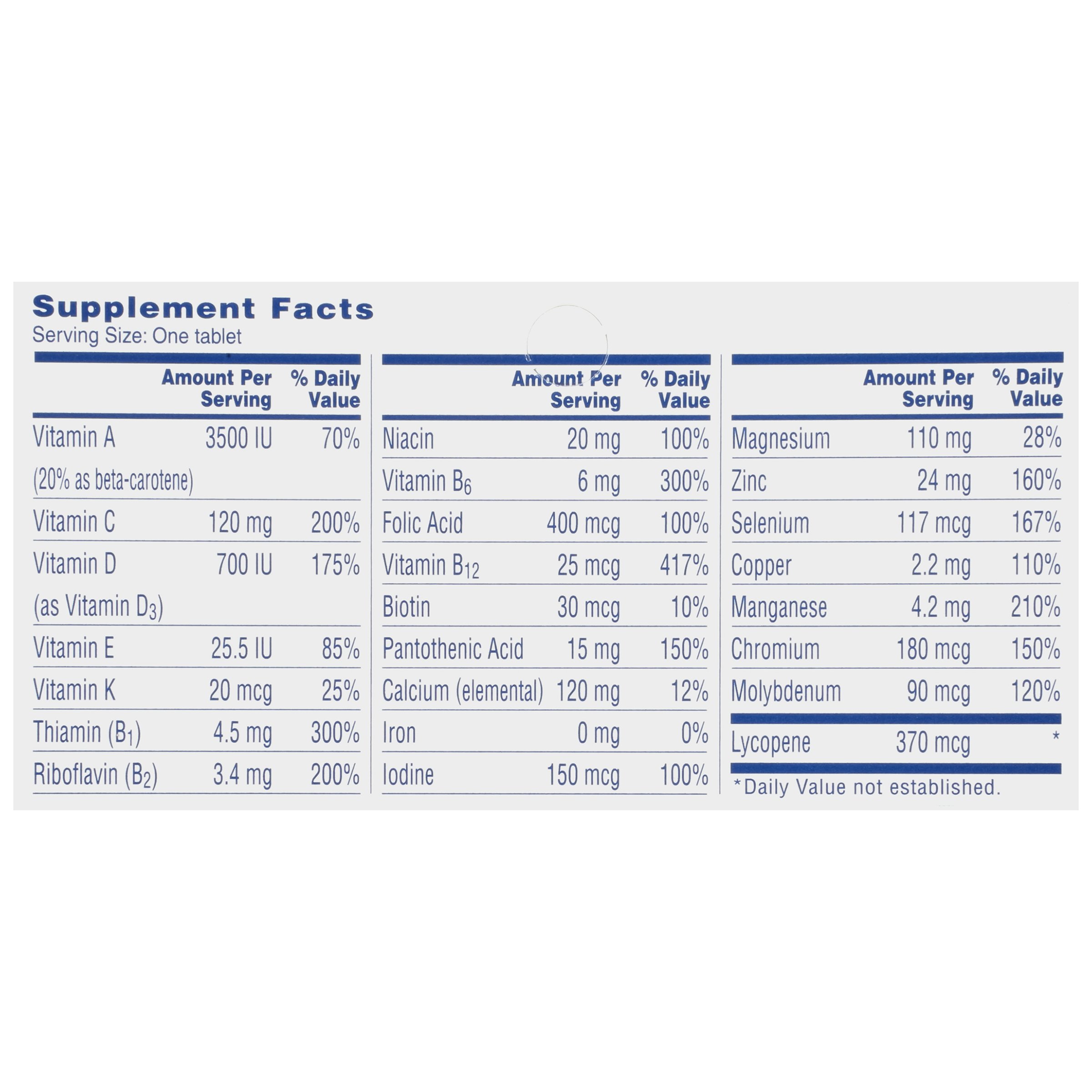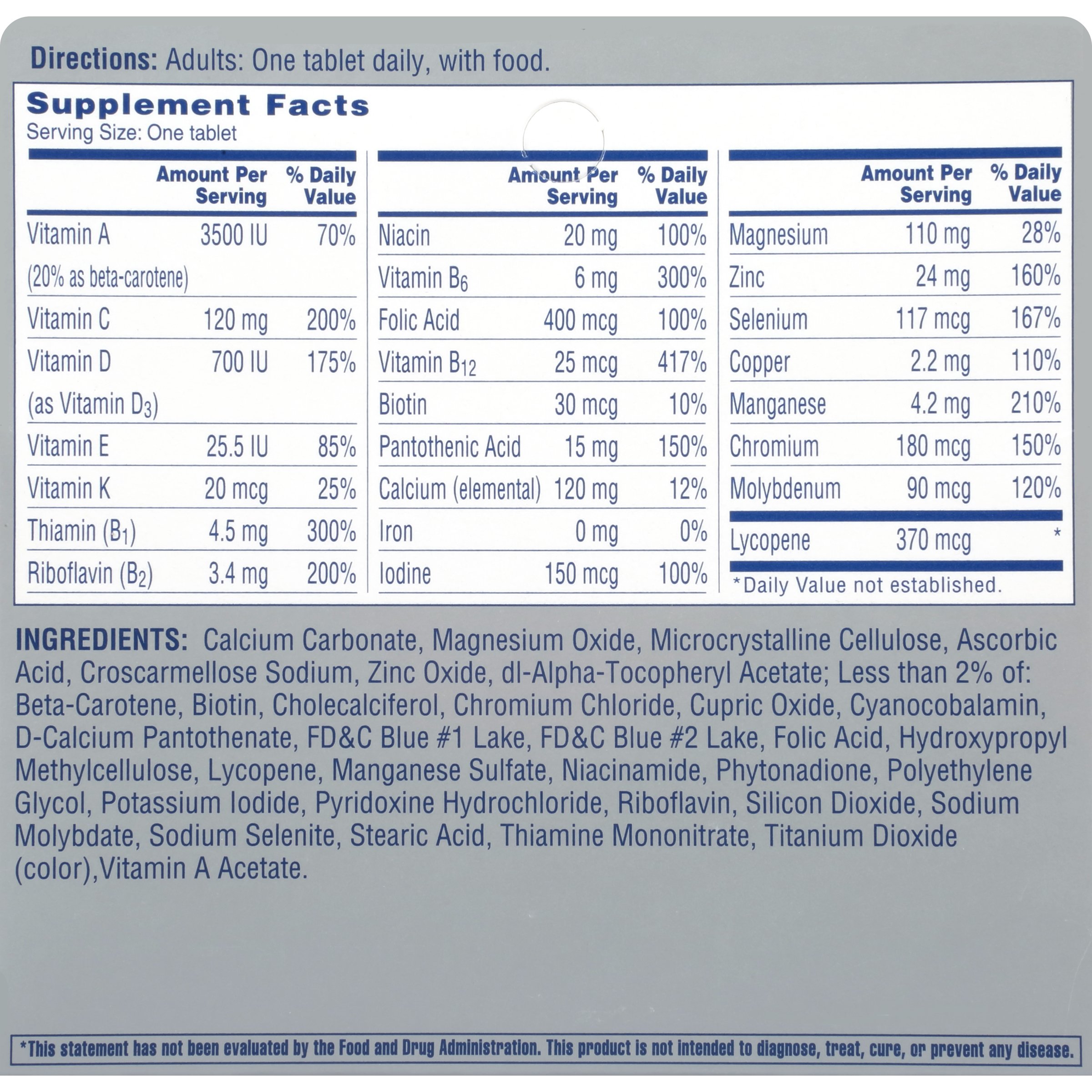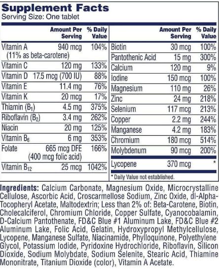 One A Day Men's 50+ Healthy Advantage Multivitamins offer 100% or more of the Daily Value of at least 15 key nutrients in a single tablet. One A Day Men's 50+ Healthy Advantage is designed to address health concerns of men as they age. This daily multivitamin contains Vitamins A, C, and E, Zinc, Selenium, Copper and Manganese to support cell health.* One A Day Men's 50+ Healthy Advantage is formulated to support:* cell health, heart health, healthy blood pressure**, immune health, physical energy* by helping convert food to fuel, and eye health.* One A Day Men's 50+ Healthy Advantage Multivitamin is free of gluten, wheat, dairy, artificial flavors, and artificial sweeteners. Men over the age of 50 should take one tablet daily with food. One A Day Multivitamins provide nutritional support that you and your family may need at any life stage.