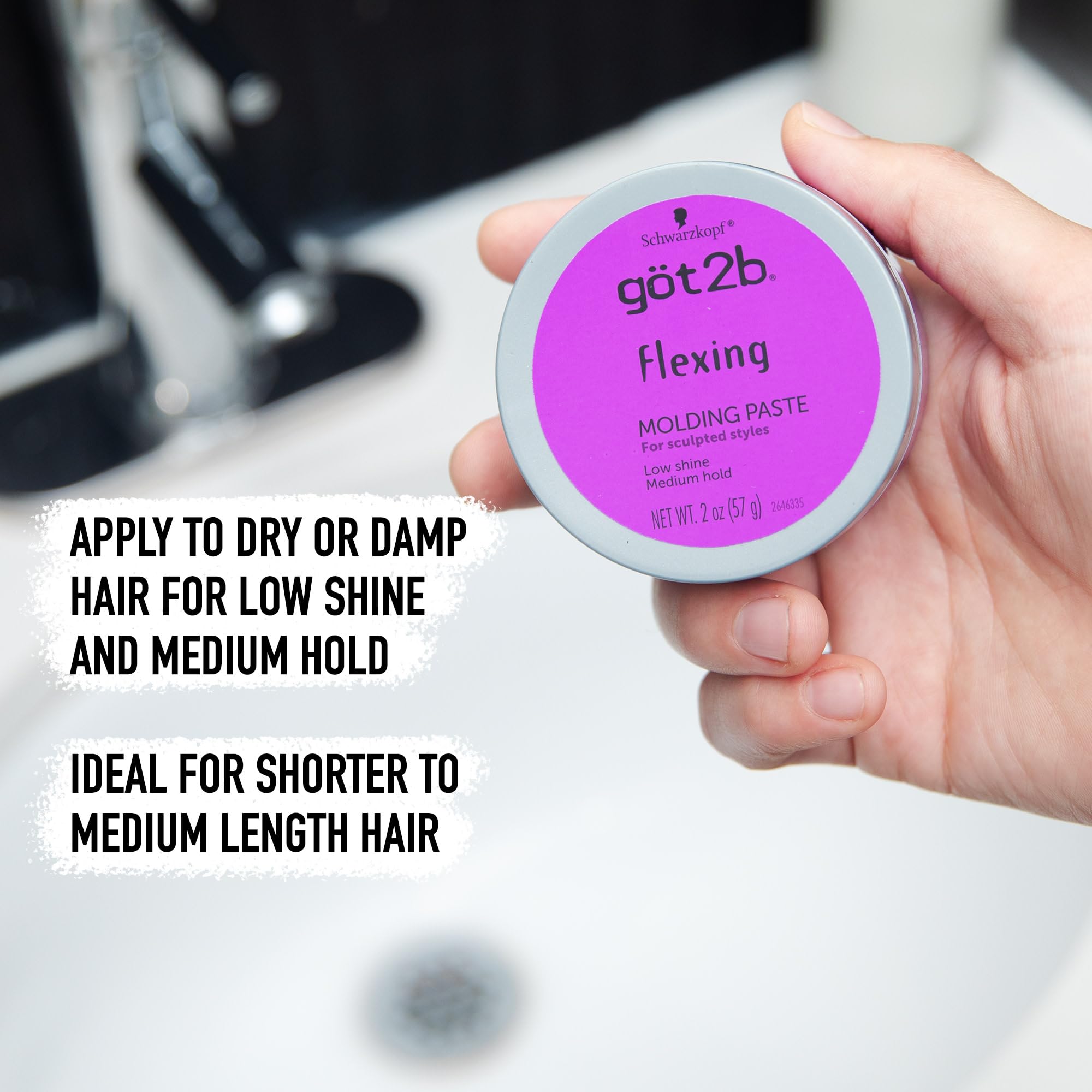 Got2B Flexing Molding Paste Style on your terms with got2b Flexing Molding Paste—the go-to paste for short to medium styles that need shape, hold, and texture without the crunch. Whether you're working a tousled fade, messy crop, or controlled side part, this unisex formula offers medium hold and low shine for a naturally defined finish. The clay-like texture glides easily into damp or dry hair, making styling effortless. You get all the definition with a formula is easy to apply and washes out cleanly with your everyday shampoo. Simply work a dab into dry or damp hair and style as desired. Suitable for all hair types, including fine or thin textures, this paste won’t weigh hair down. It’s great for day-to-night looks, from casual brunches to high-energy concerts. got2b Flexing Molding Paste gives you the freedom to flex your look. Be bold, be defined, be whoever you want 2b.