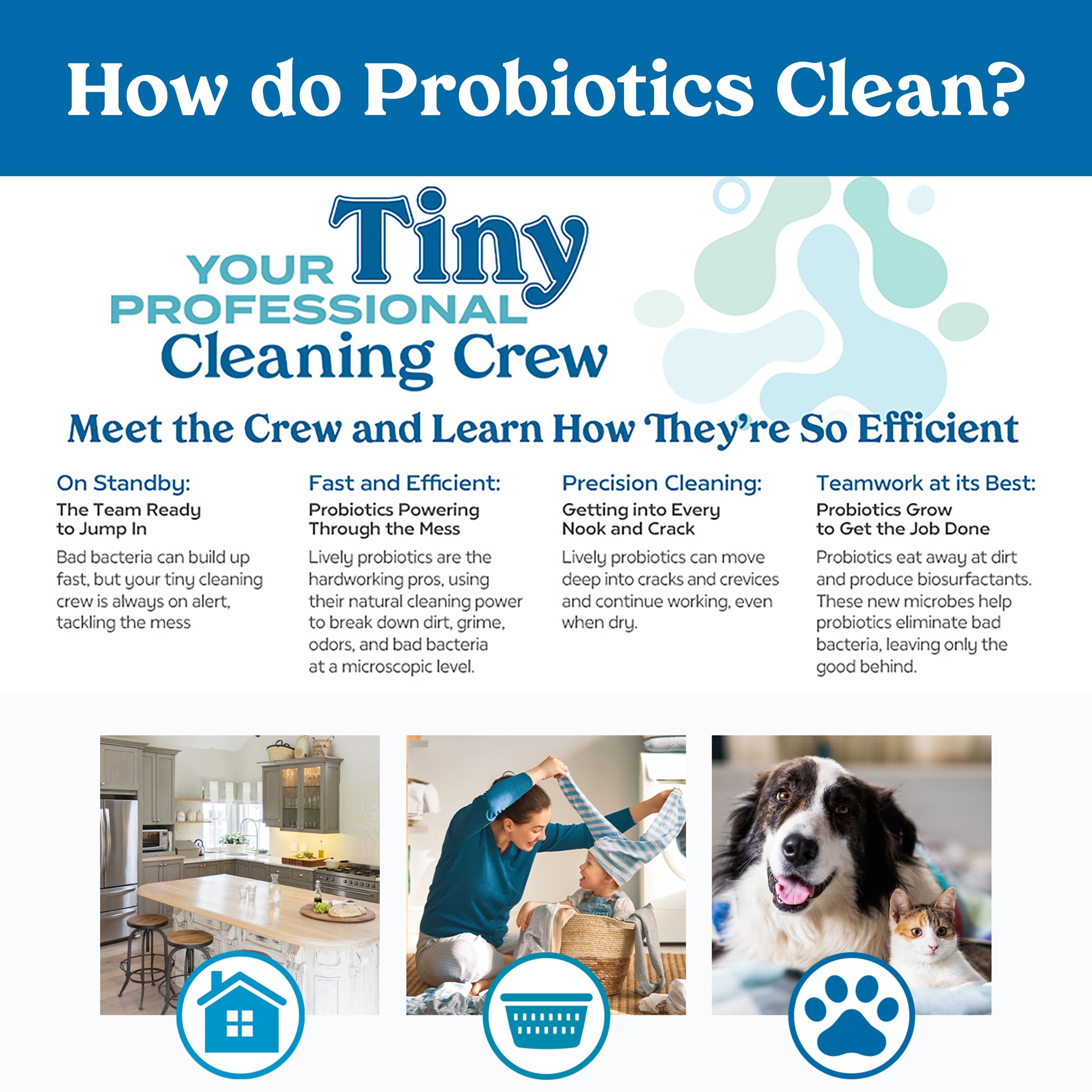 No more leftover odors lurking in carpets or pet beds. Our “tiny professional cleaning crew” (probiotics) continues to work even after you’re done spraying, breaking down any lingering mess so your home remains.