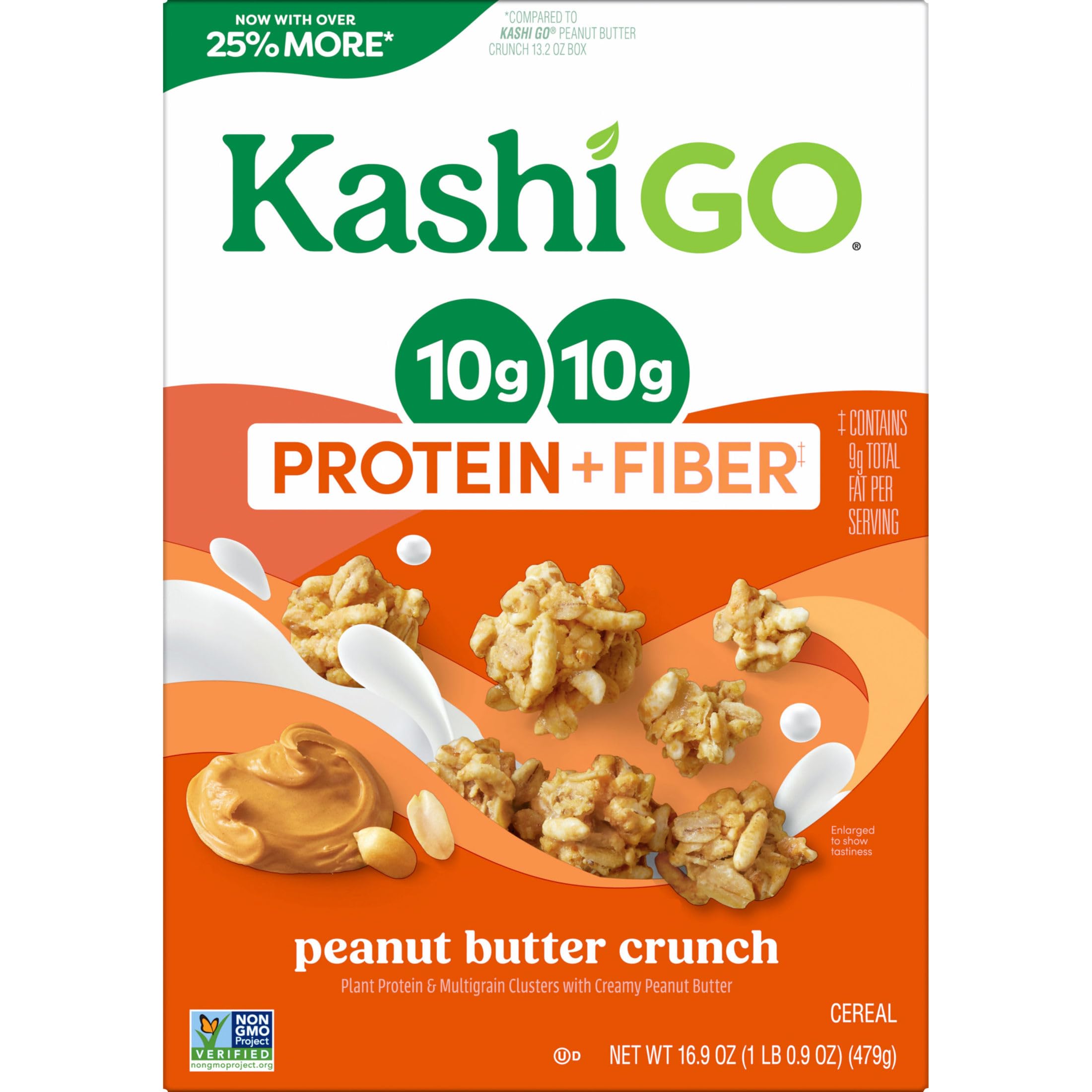 Get up and go with the delicious taste of creamy peanut butter and crispy multigrain clusters in Kashi GO Peanut Butter Crunch protein cereal. Whether it's part of your breakfast or a midday snack, this vegan cereal delivers a sweet and satisfying crunch in every spoonful. Non-GMO Project Verified, each wholesome serving provides 10g of protein (16% daily value per serving) and 10g of fiber (contains 9g total fat per serving); It's a tasty way to level up your day with plant protein. Enjoy this cereal with your favorite milk, or pair with fruit or yogurt for a nourishing part of a tasty breakfast or a hearty snack. Just pack this yummy mix in your backpack, lunch box, or gym bag. It also makes a great after-dinner treat by the handful. Anytime is the right time for Kashi GO Peanut Butter Crunch breakfast cereal.