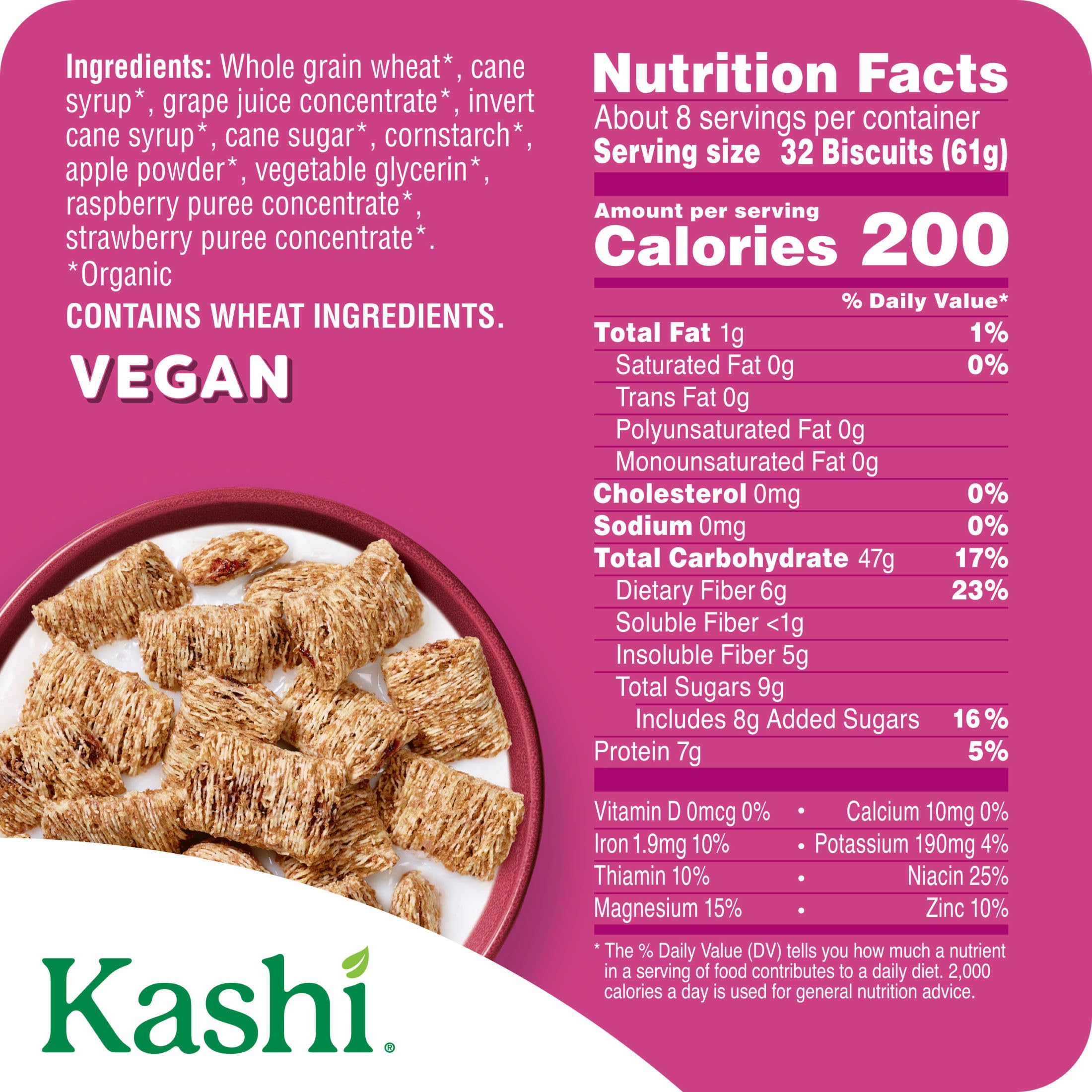 Kick off your day with a berry blast! Wake up and enjoy Kashi Berry Fruitful cereal, made with hearty, whole grain biscuits filled with a sweet blend of berries the whole family will love. This organic breakfast cereal contains 7g of protein and 6g of fiber per serving. Vegan and Non-GMO Project Verified, it combines delicious, high-quality ingredients that deliver tasty nutrition and fiber to satisfy. It’s a quick and easy way to brighten your morning; Pack reusable baggies of this fiber cereal in your backpack for a tasty treat between meals. It’ll put a smile on your face and help keep you going. Made with organic ingredients, each nourishing bite of this cereal packs in berry-tastic flavor you can feel good about. Kids and adults alike love the shredded wheat biscuits with a touch of fruit in each spoonful with your favorite milk. Whether you’re starting or ending your day, Kashi Berry Fruitful cereal is a wholesome choice.