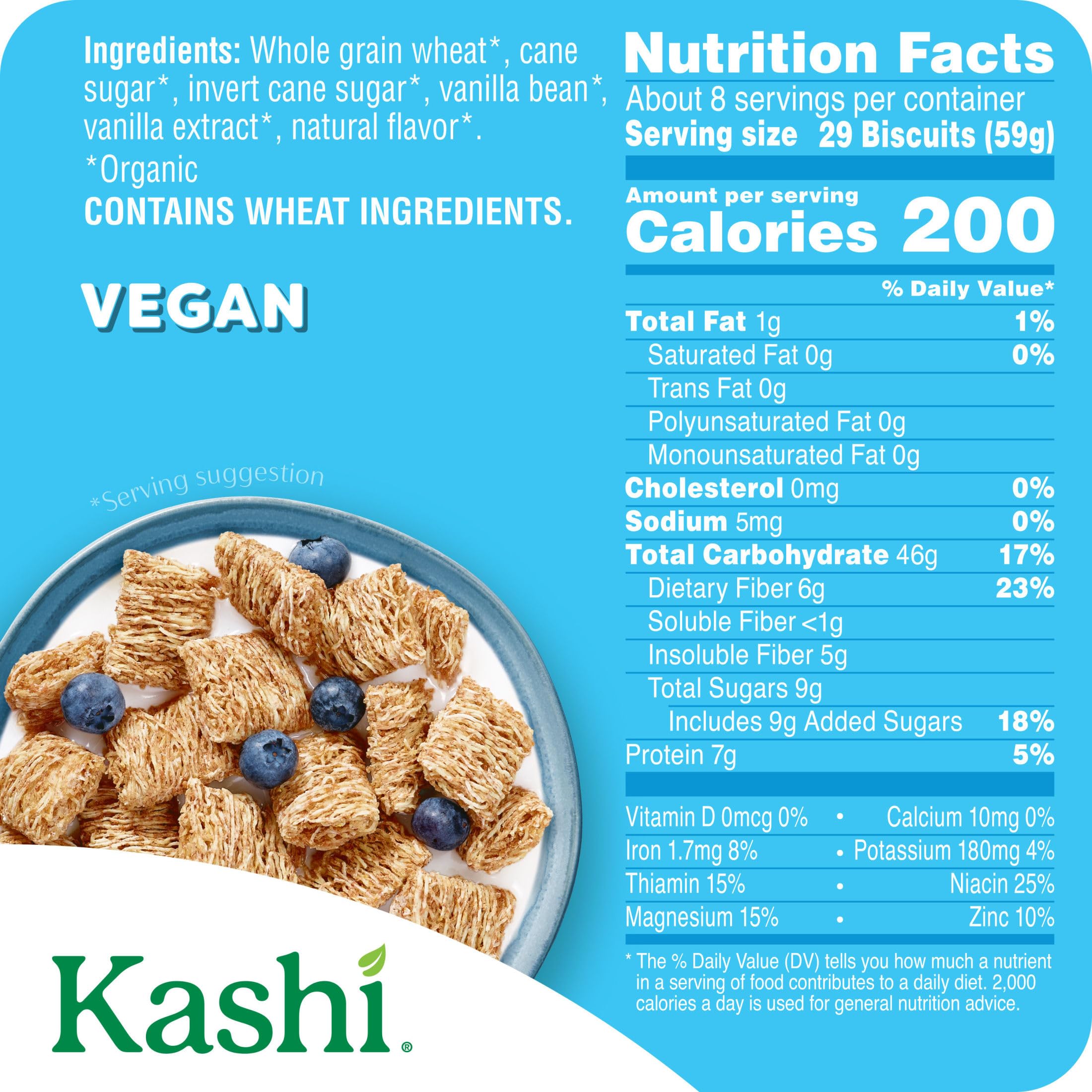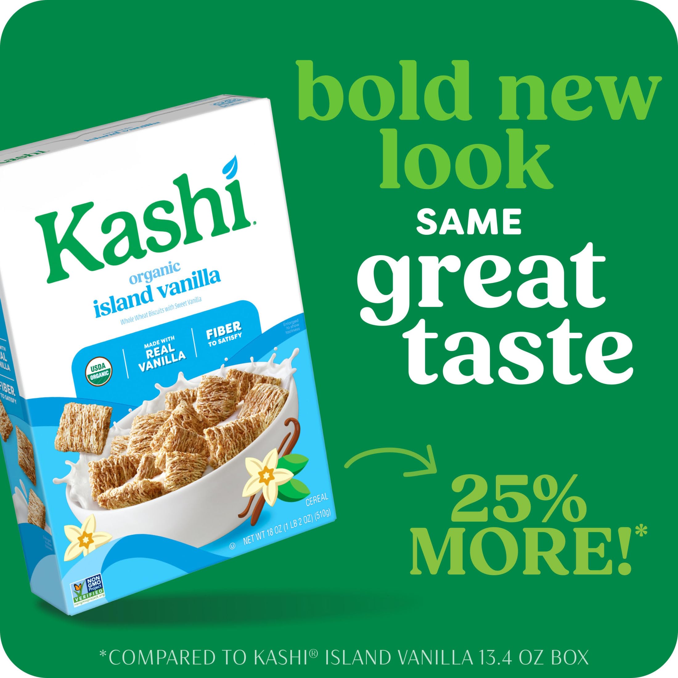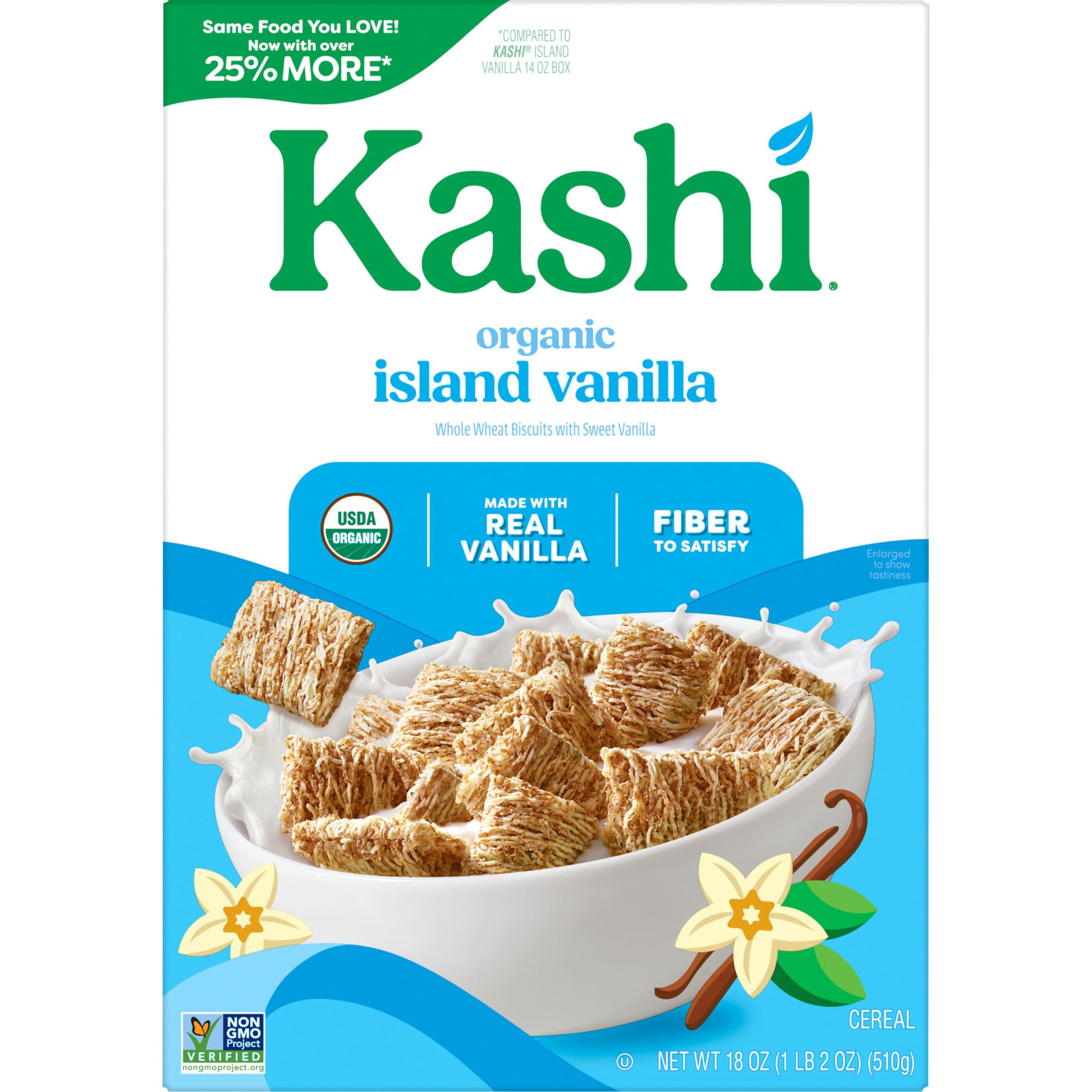 Escape to a breakfast paradise of flavor! Wake up and enjoy the calming oasis of Kashi Island Vanilla cereal, made with hearty, whole grain biscuits and real, organic vanilla beans the whole family will love. This organic breakfast cereal contains 7g of protein (5% daily value per serving) and 6g of fiber per serving. Vegan and Non-GMO Project Verified, it combines delicious, high-quality ingredients that deliver tasty nutrition and fiber to satisfy. It’s a quick and easy way to brighten your morning; Pack reusable baggies of this fiber cereal in your backpack for a tasty treat between meals. It’ll put a smile on your face and help keep you going. Made with organic ingredients, each nourishing bite of this cereal packs in vanilla-tastic flavor you can feel good about. Kids and adults alike love the shredded wheat biscuits in each spoonful with your favorite milk. Whether you’re starting or ending your day, Kashi Island Vanilla cereal is a wholesome choice.