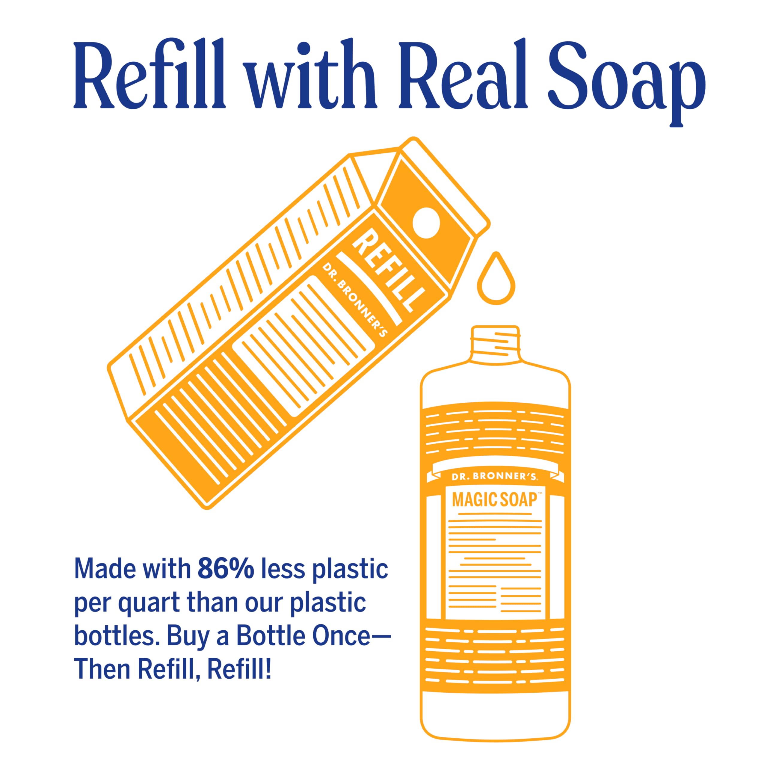 Discover the power of Dr. Bronner’s Pure-Castile Liquid Soap Refill, now in our eco-friendly packaging: a refill carton that uses 86% less plastic per quart than traditional bottles. Whether you love invigorating peppermint, soothing lavender, or gentle unscented, every variant is crafted for a clean that’s gentle on your skin and kind to the planet. Certified Organic & Fair Trade Ingredients Crafted with certified organic and fair trade ingredients, including sustainably harvested coconut oil from Sri Lanka, our soap supports ethical supply chain practices and environmental sustainability. Whether scented or fragrance-free, every formula is made with care for your body—and the world around you. Real Soap, No Synthetic Detergents Our body wash with nourishing oils is free from synthetic detergents, thickeners, or foaming agents. It’s perfect for sensitive skin, providing a natural, clean feel while being conscientiously produced. Enjoy a pure, plant-basedl body wash that’s both gentle and effective. Highly Concentrated Formula with 18-in-1 Uses Dr. Bronner’s Castile Soap is 3X more concentrated than most liquid soaps. Its 18-in-1 uses make it perfect for shower soap, body wash, hand soap, as well as laundry, mopping, dishes, and even washing pets. With multiple uses from a single carton, it helps minimize waste and packaging, making it a practical and eco-friendly choice.