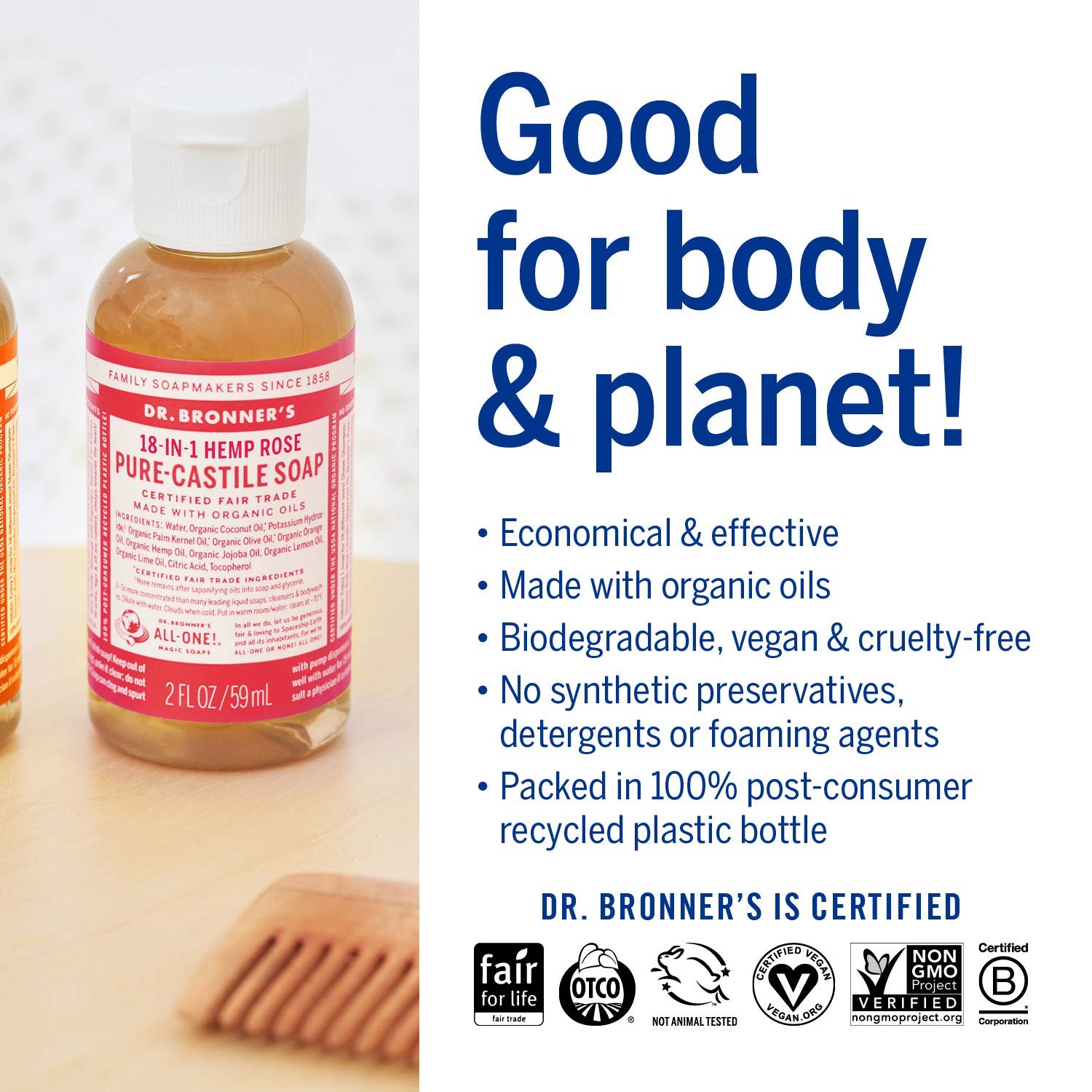 Dr. Bronner's - Pure-Castile Liquid Soap (Rose, 2 ounce) - Made with Organic Oils, 18-in-1 Uses: Face, Body, Hair, Laundry, Pets and Dishes, Concentrated, Vegan, Non-GMO