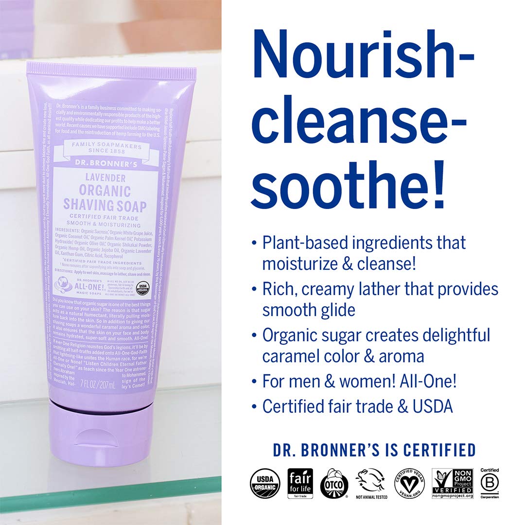 Dr. Bronner's Organic Shaving Soap– (Lavender, 7 Ounce)– Moisturizing Shave Soap for Men & Women– Certified Organic Sugar & Shikakai– For Face, Underarms & Legs