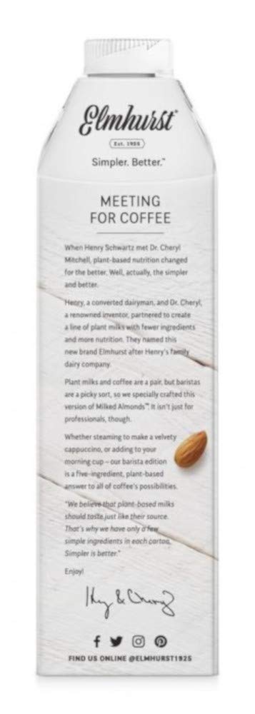 Barista Edition Blended with rice. No artificial flavors. Contains 3 g of protein. Dairy free. Gluten free. Vegan. Non GMO. Non-GMO Project verified. nongmoproject.org. Est. 1925. Simpler. Better. Plant based. Steams & froths. Beautifully. No added gums or emulsifiers. Meeting for Coffee: When Henry Schwartz met Dr. Cheryl Mitchell, plant-based nutrition changed for the better. Well, actually, the simpler the better. Henry, a converted dairyman, and Dr. Cheryl, a renowned inventor, partnered to create a line of plant milks with fewer ingredients and more nutrition. They named this new brand, Elmhurst 1925, after Henry's family dairy company. Plant milks and coffee are a pair, but baristas are a picky sort, so we blended almonds with rice to craft a product for coffee that steams into the a more flexible microfoam that baristas love. It isn't just for professionals, though. Whether steaming to make a velvety cappuccino, or adding to your morning cup - our barista edition is a six-ingredient, plant-based answer to all of coffee's possibilities. We believe that plant-based milks should taste just like their source. That's why we have only a few simple ingredients in each carton. Simpler is better. Enjoy! 2 in 1 Steamer Creamer: Whether making a perfect microfoam, or adding flavor and texture to your morning cup, we have your coffee needs covered. 0 no added gums or oils. Many other plant-based creamers add gums like gellan, guar, locust bean, lecithin, or carrageenan. We don't, and never will. Carrageenan free. Why do we use dipotassium phosphate? This safe water-soluble salt is less than 2% of our product and provides the performance baristas need. elmshurst1925.com. Facebook. Twitter. Instagram. Pinterest. Let's get social (at)elmhurst1925. To learn more about our products, visit elmhurst1925.com. Please recycle. recyclecartons.com. FSC: Mix - Board from responsible sources. www.fsc.org.
