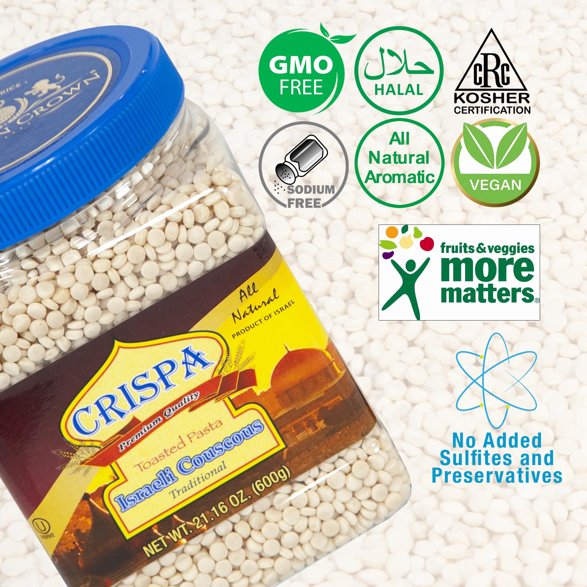 Crispa Premium Quality Traditional Israeli Couscous - 21.16 oz (1.3Lb) | All Natural Product of Israel Having No Cholesterol and 0.5g | Total Fat, 220 Amount Per Serving Calories Toasted Pasta