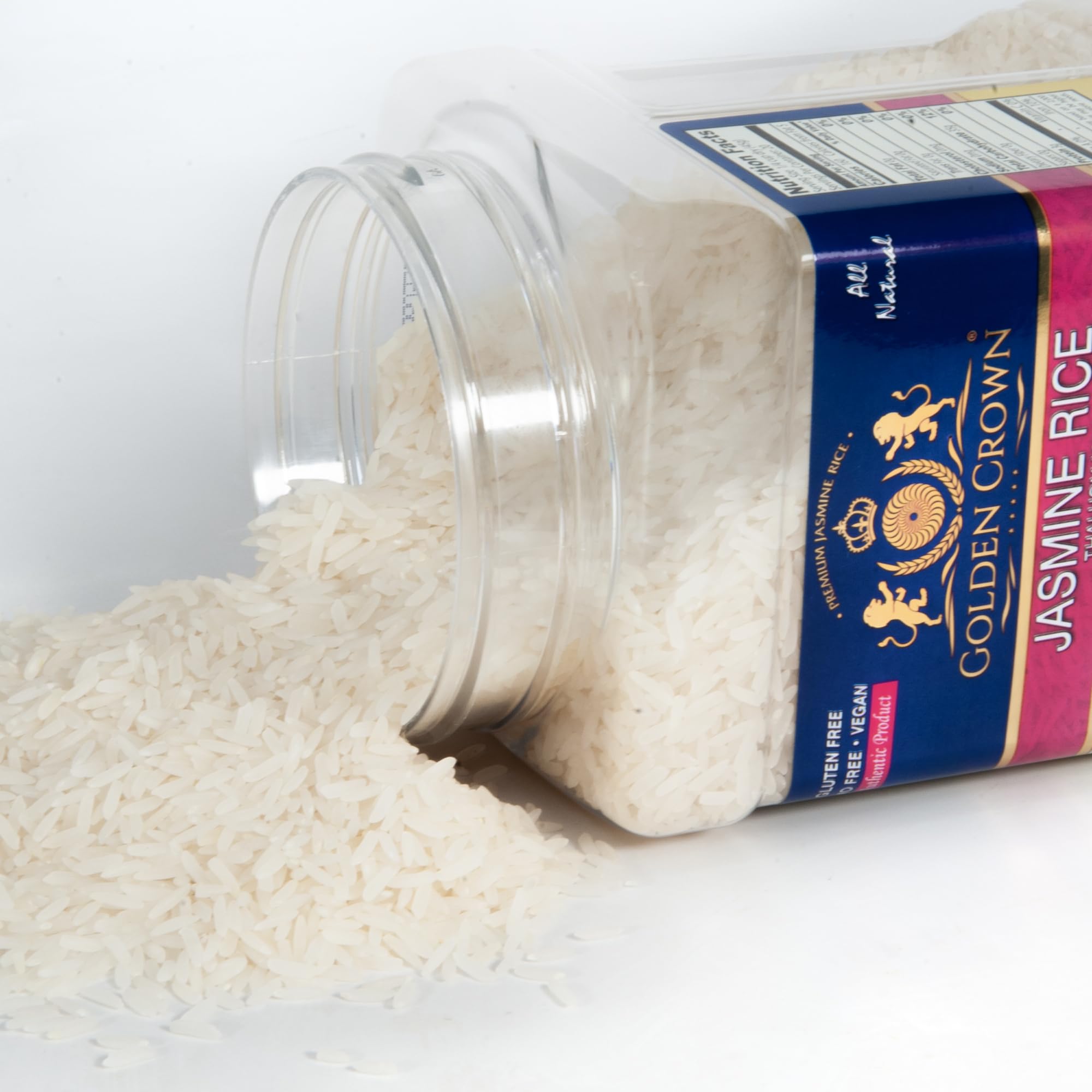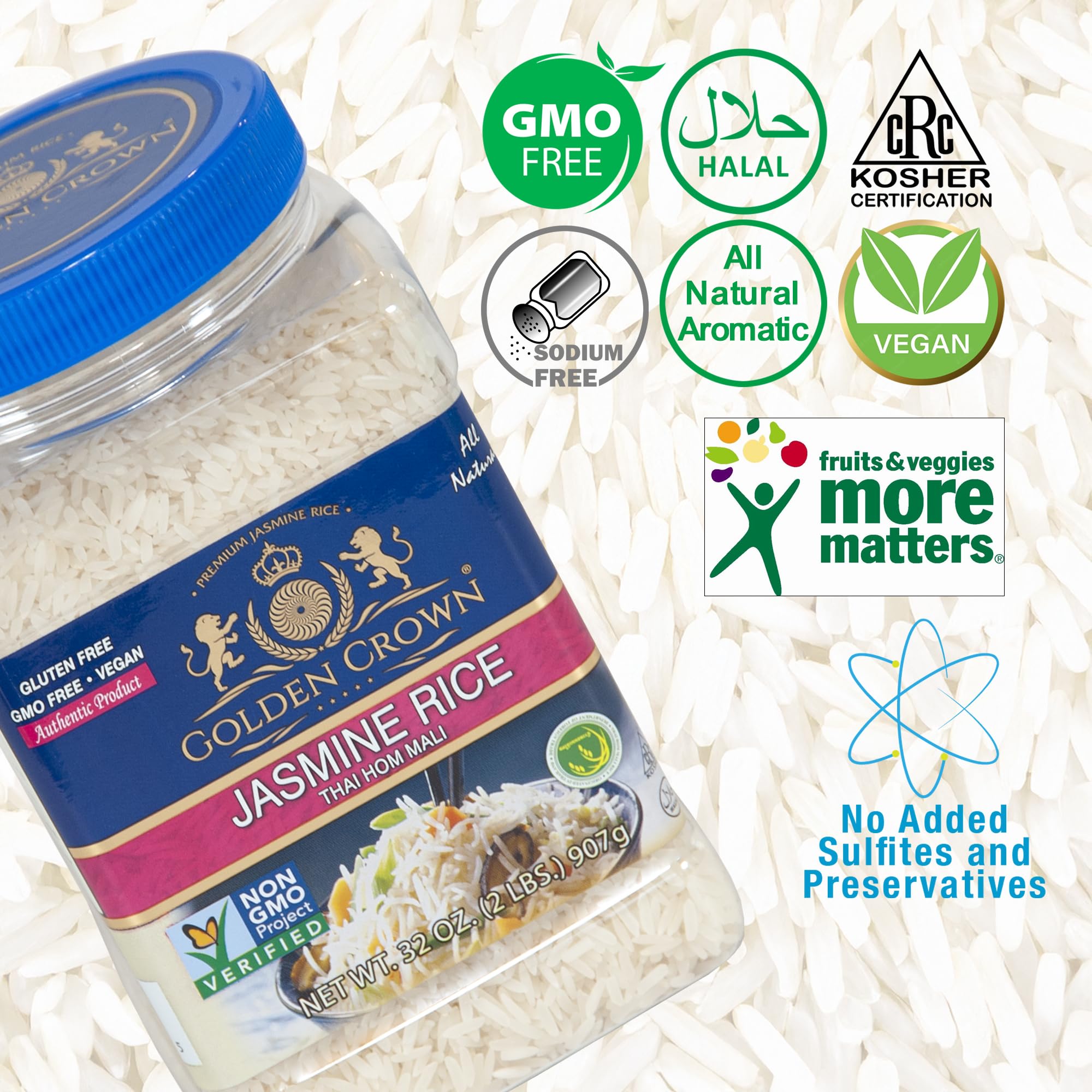 Golden Crown Jasmine Rice - 32 oz (2 LB) Jar, Non-Sticky, Fluffy Aromatic Rice, Thai, Indian, & Fragrant Flavored Long-Grain White Rice