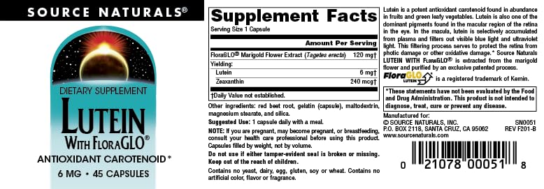 Source Naturals Lutein with FloraGLO, Antioxidant Carotenoid* -6 mg, 45 Capsules