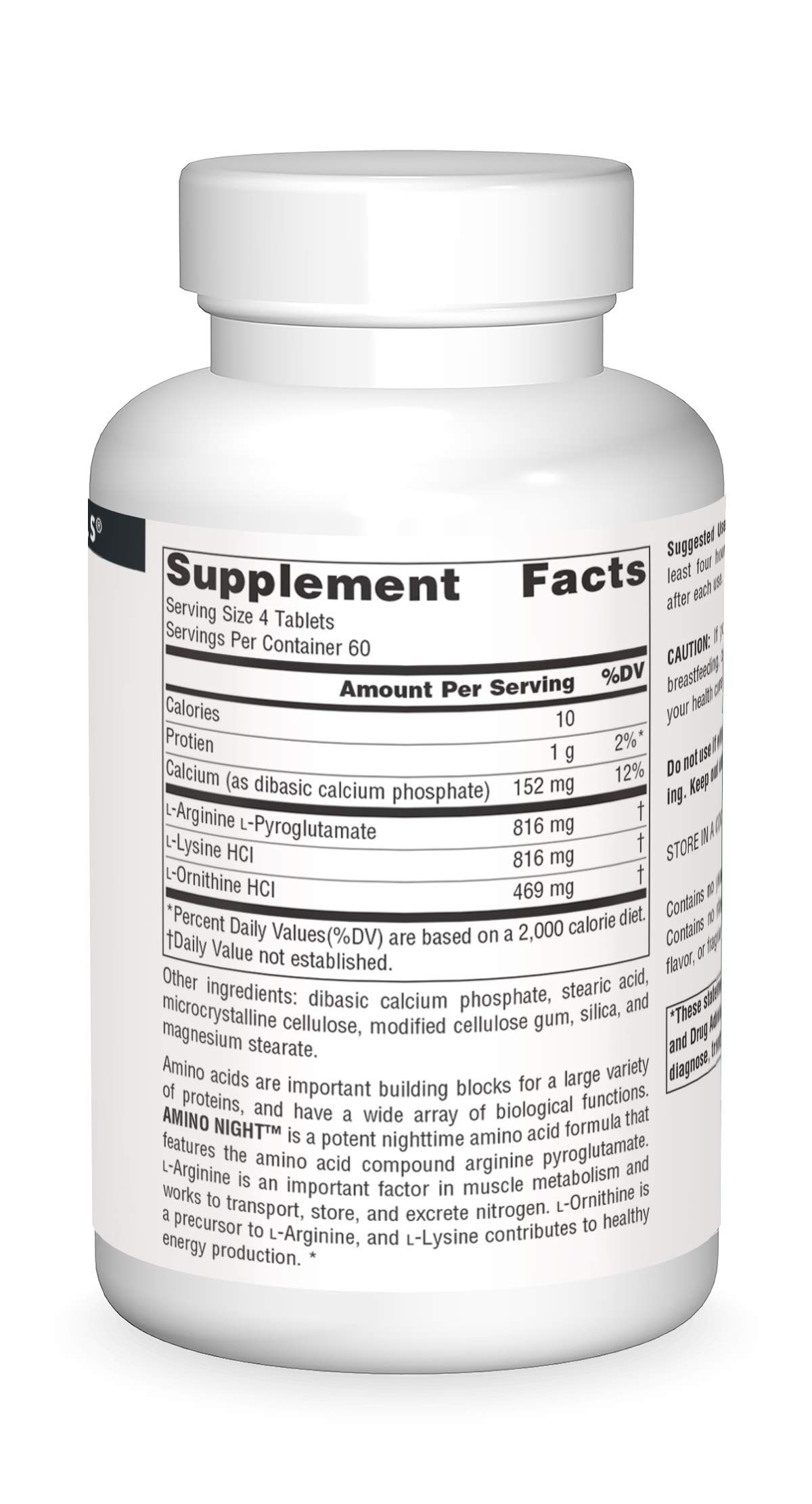 Source Naturals Amino Night is a potent nighttime amino acid formula. The suggested use is 4 tablets just before going to bed, at least four hours after eating. Please contact our in-house customer support if you have any questions.