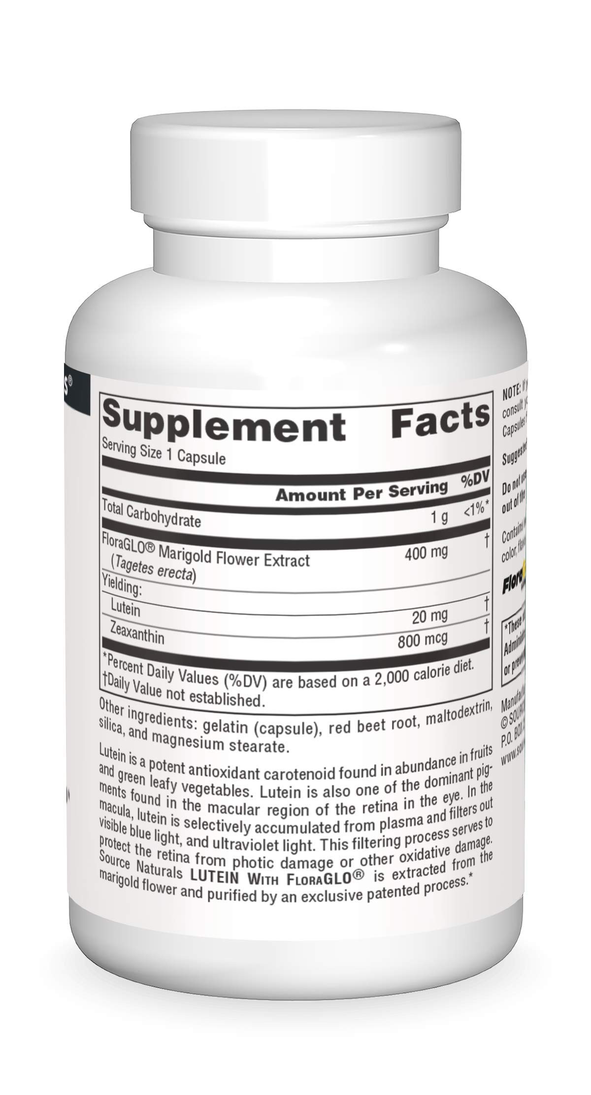 Lutein is a potent antioxidant carotenoid found in abundance in fruits and green leafy vegetables. Lutein is also one of the dominant pigments found in the macular region of the retina in the eye. In the macula, lutein is selectively accumulated from plasma and filters out visible blue light and ultraviolet light. This filtering process serves to protect the retina from photic damage or other oxidative damage. Source Naturals Lutein with FloraGLO is extracted from the marigold flower and purified by an exclusive patented process (U.S. Patent No. 5,382,714). The suggested use is 1 capsule daily with meals. If you have any questions please contact our in-house customer service team.