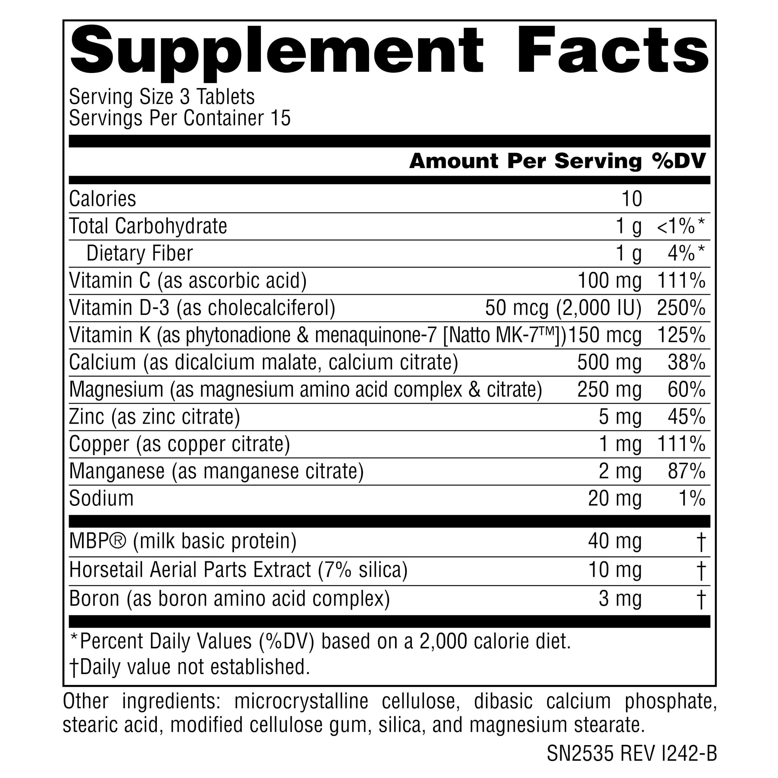 MBP Osteo is a next-generation bone density formula based on the latest scientific insights. It combines the breakthrough ingredient MBP (Milk Basic Protein) with 500 mg of calcium, a dose that emerging science suggests is beneficial, and vitamin D-3 to maximize calcium absorption. Shown in four clinical studies to promote healthy bone density in just six months, MBP activates bone-building cells and appears to help bones efficiently utilize dietary calcium. Vitamins C, K-1, and K-2 support the production of proteins needed to form a strong bone scaffold.