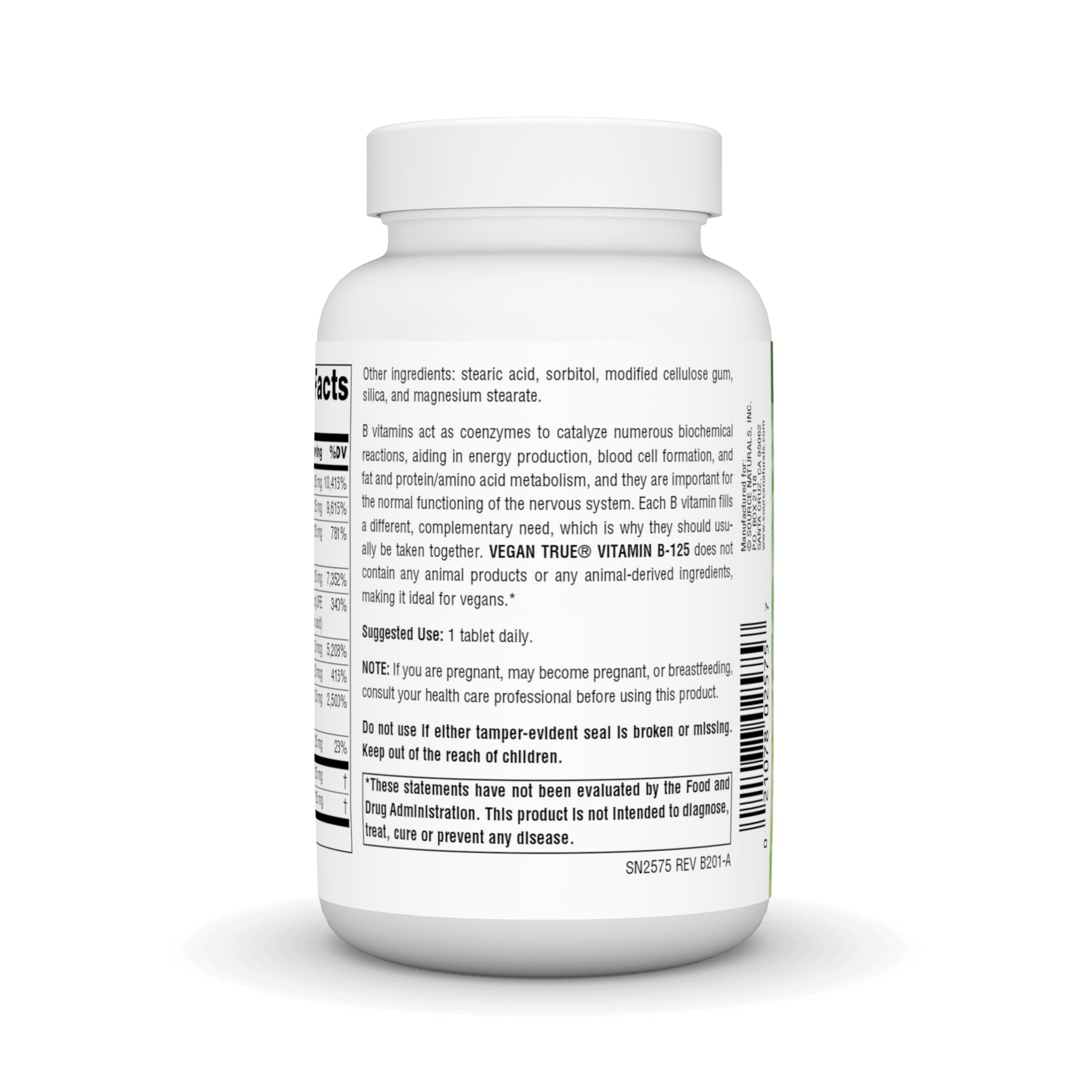 B vitamins act as coenzymes to catalyze numerous biochemical reactions, aiding in energy production, blood cell formation, and fat and protein/amino acid metabolism, and they are important for the normal functioning of the nervous system. Each B vitamin fills a different, complementary need, which is why they should usually be taken together. Vegan True Vitamin B-125 does not contain any animal products or any animal-derived ingredients, making it ideal for vegans.