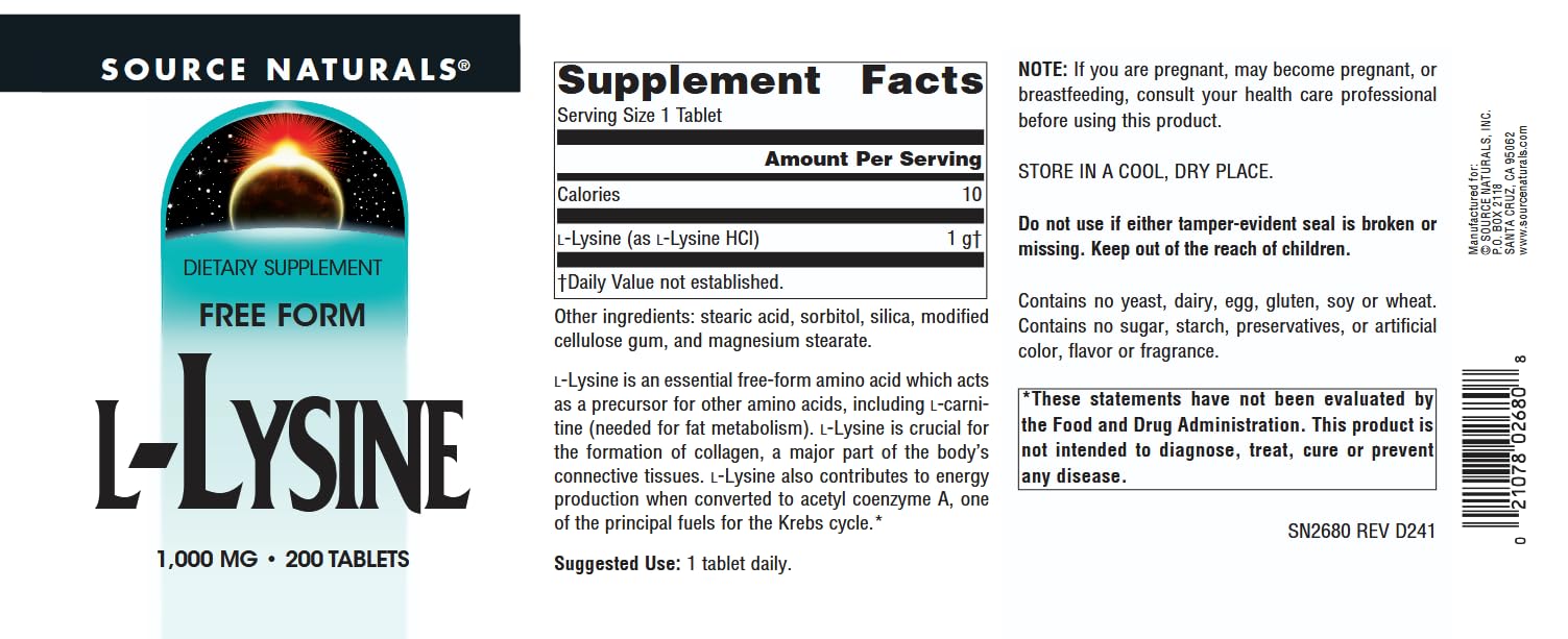 Source Naturals L-Lysine Free Form, 1000 mg* - 200 Tablets