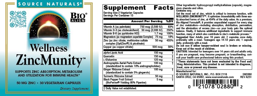 Source Naturals Wellness ZincMunity, Supports Zinc Absorption, Metabolism and Utilization for Immune Health*, 50 mg Zinc - 30 Vegetarian Capsules