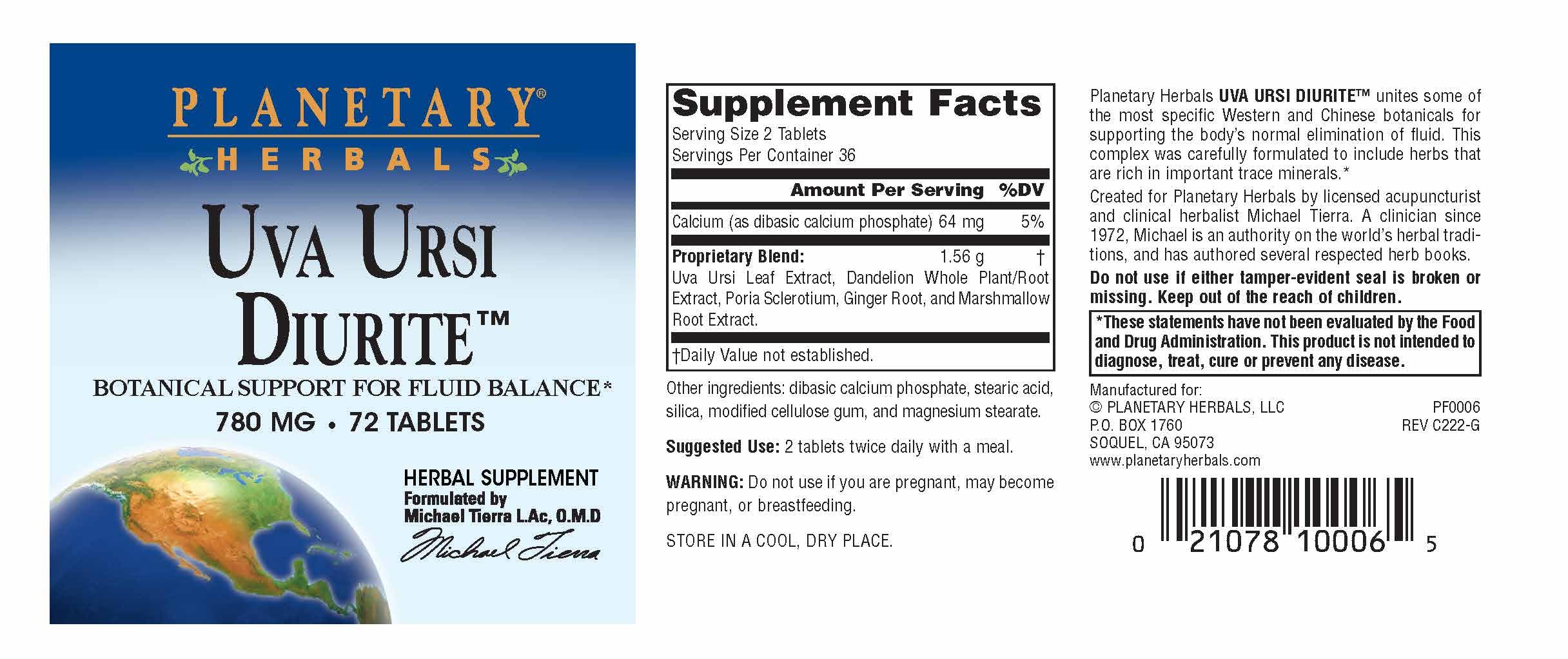 Planetary Herbals UVA ursi diurite provides botanical support for fluid balance. Supports the body's normal elimination of fluid. Rich in important trace minerals. Unites some of the most specific western and Chinese botanicals.