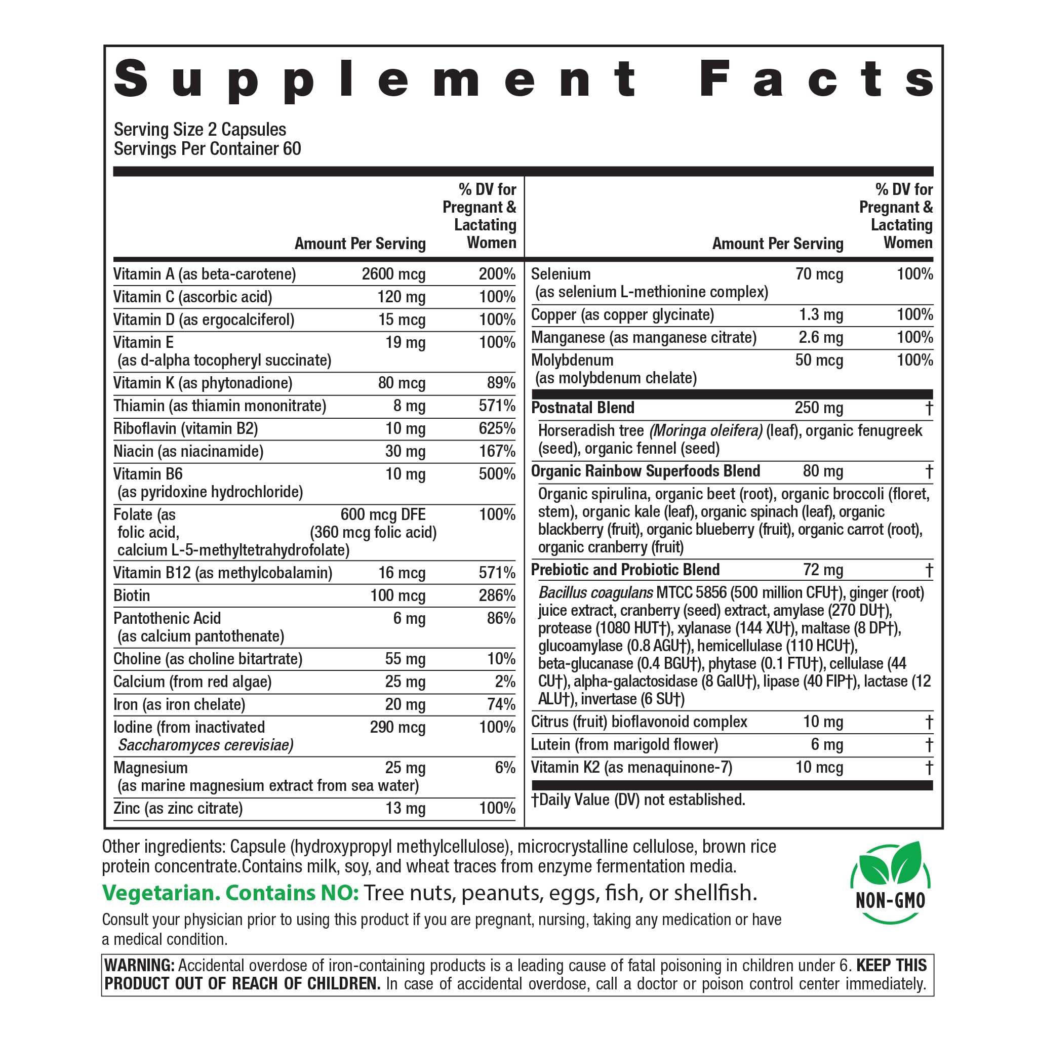 Each serving of Rainbow Light® Postnatal Multivitamin capsules includes targeted digestive support to help new moms feel their best.* This formula features a specialized blend of digestive enzymes, prebiotics and probiotics that work together to support gut health.*