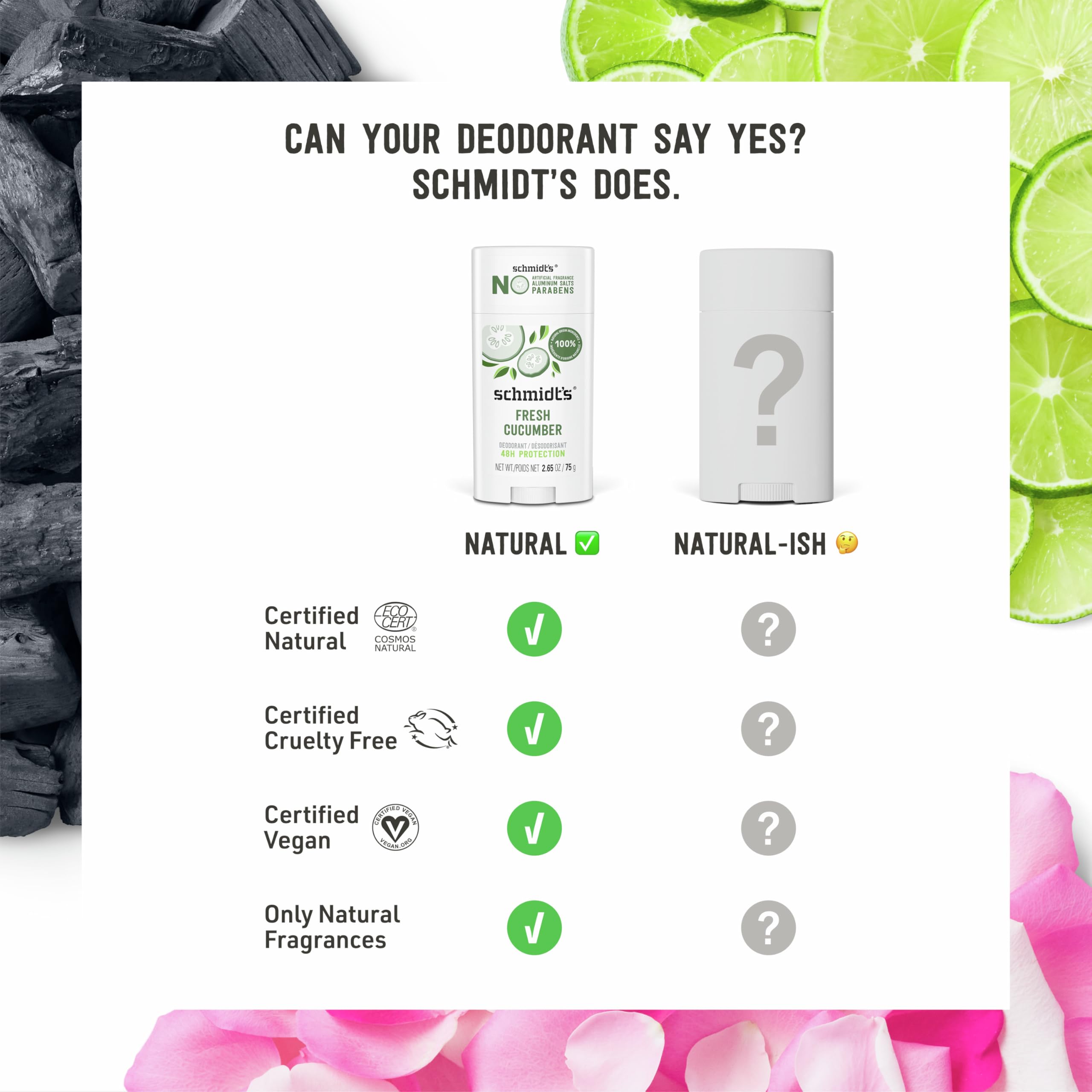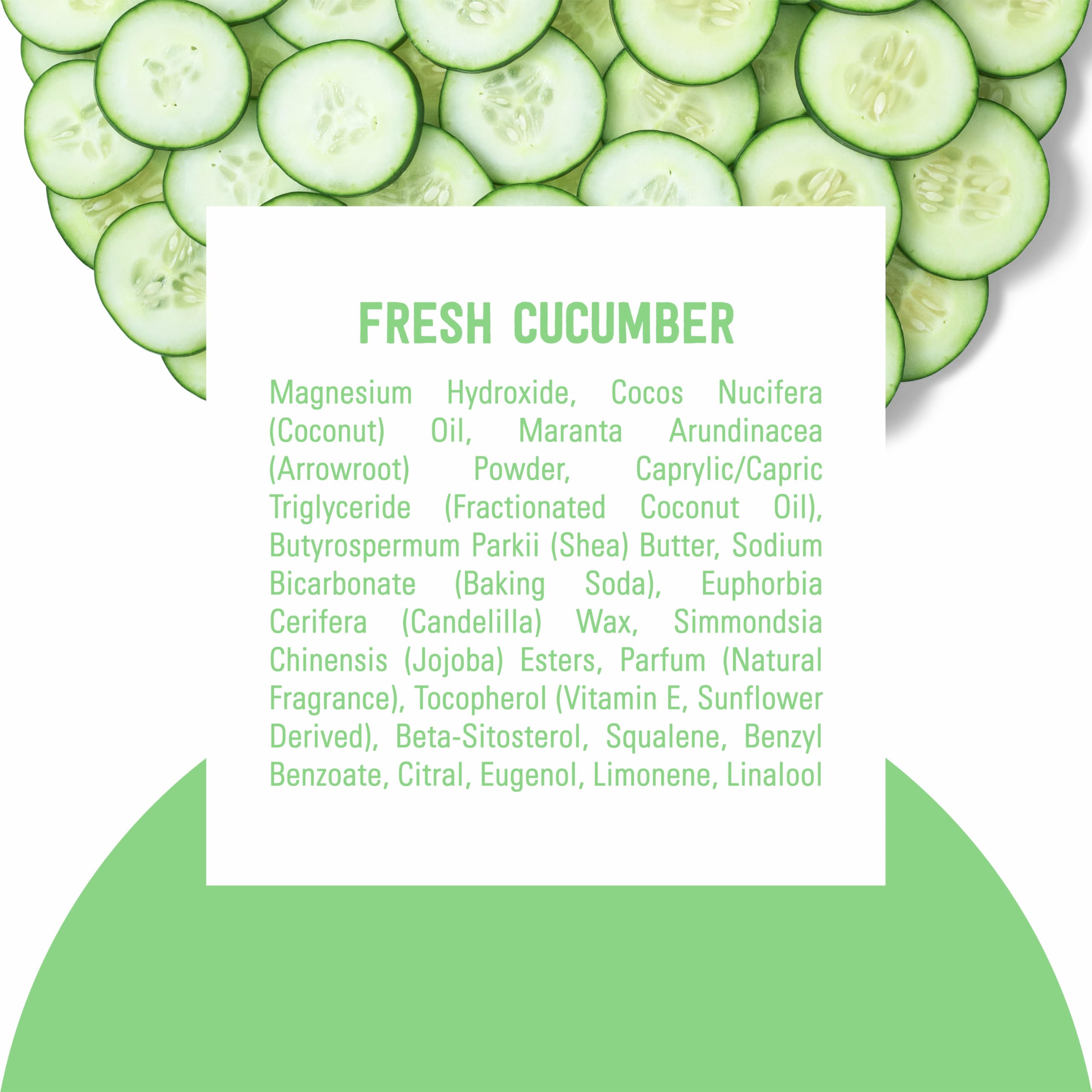 Really Works. Schmidt’s Fresh Cucumber— Formulated with certified 100% natural origin ingredients, this deodorant for women and men is made without aluminum. It’s also certified vegan by Vegan Action and cruelty-free by Leaping Bunny. Our women's and men’s deodorants are naturally enriched with magnesium to help neutralize odor and keep you fresh with 24-hour odor protection that’s gentle on skin. Schmidt’s offers some of the best smelling deodorants for men and women and is made with plant-based oils and butters like coconut oil, jojoba seed oil, and shea moisture butter, as well as vitamin E. Luxurious, long-lasting scents made with 100% natural origin fragrance are never synthetic, always made with plant isolates and essential oils like tea tree oil, jasmine oil, and lavender oil. All our Schmidt’s vegan deodorant sticks require only a small amount for overall effectiveness. To use, hold the deodorant briefly to skin to soften on contact with your body heat. Gently apply 1–2 swipes to dry, clean underarms to keep you feeling fresh all day. This aluminum free deodorant for men and women uses a non-greasy/non-sticky formula that is easily absorbed. Do not apply to irritated, damaged, or freshly shaved skin.