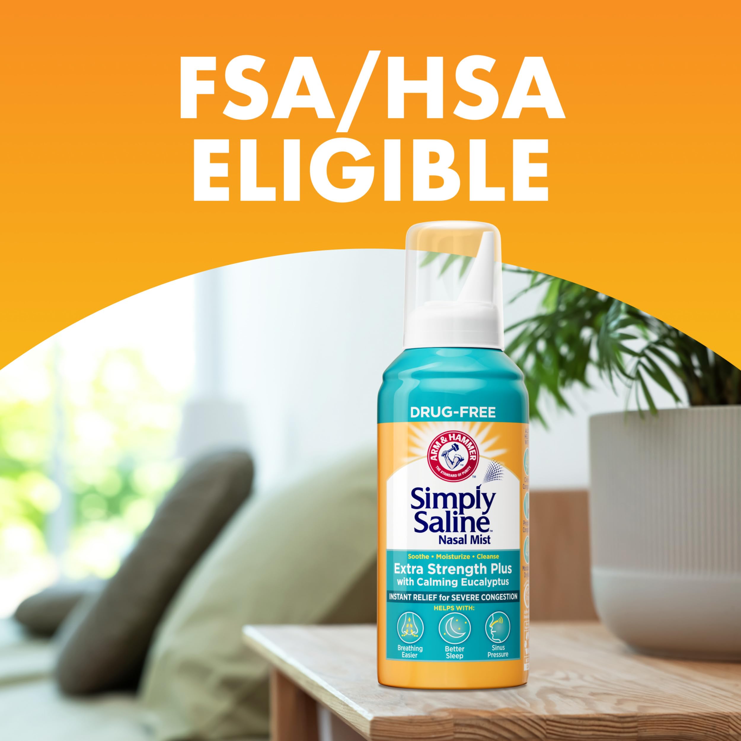 Get instant relief for severe nasal congestion with drug-free ARM & HAMMER Simply Saline Extra Strength Plus Nasal Mist with Calming Eucalyptus. It starts working in seconds to help soothe and moisturize dry noses, and to relieve severe congestion and sinus pressure, to help you breathe easier so you can sleep better. During the day and night, its comforting mist helps relieve runny noses and flushes out dust, dirt, pollen and debris from nasal and sinus passages. Itβs suitable for pregnancy congestion and safe to use as often as needed for adults and kids ages 2+. This spray is non-habit forming, and can be used with prescriptions and OTC medications. Its steroid-free formula is made with ingredients including purified water, salt, eucalyptus, and ARM & HAMMER Baking Soda. Before the first use, expel a short stream of mist into the air, then insert the nozzle tip to coat nasal passages, and to flush and irrigate sinuses (see specific package directions). ARM & HAMMER Simply Saline is proud to be the number-one recommended brand by pharmacists and doctors in the non-medicated saline nasal spray category.(1) (1)Sources: Pharmacy Times, 2025 & ProClaim Solutions, 2025