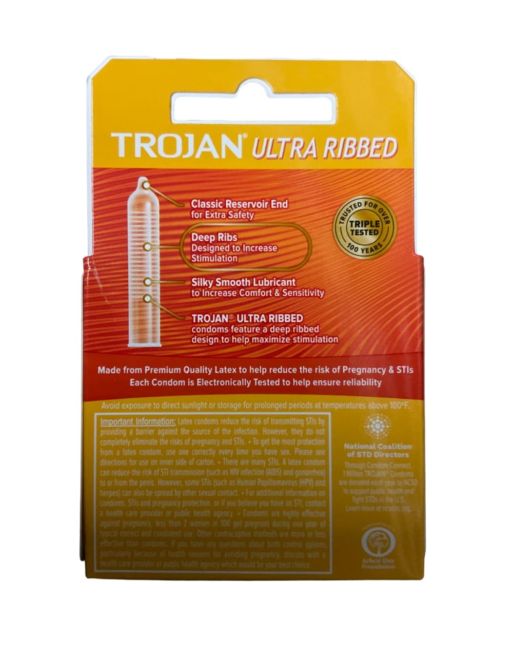 Trojan 3’s Brown Ribbed Lubricated Condoms (Pack of 6) are designed to combine comfort, protection, and sensation in every experience. Each condom is made from premium latex and features a ribbed texture that enhances pleasure for both partners. The smooth lubricant coating ensures easy application and added comfort during use. Electronically tested for quality and reliability, these condoms offer trusted protection you can depend on. The compact 3-count packs are convenient for travel and discreet storage, with six packs included for lasting supply.