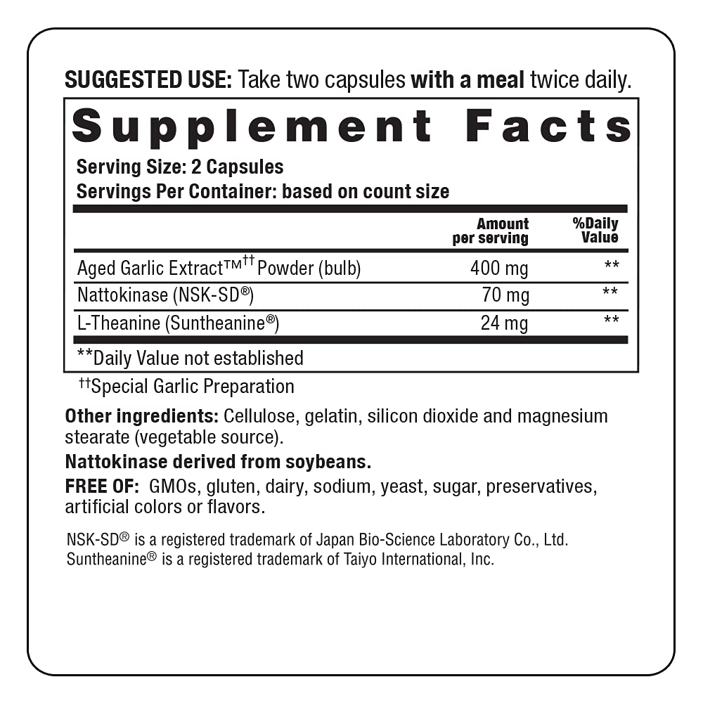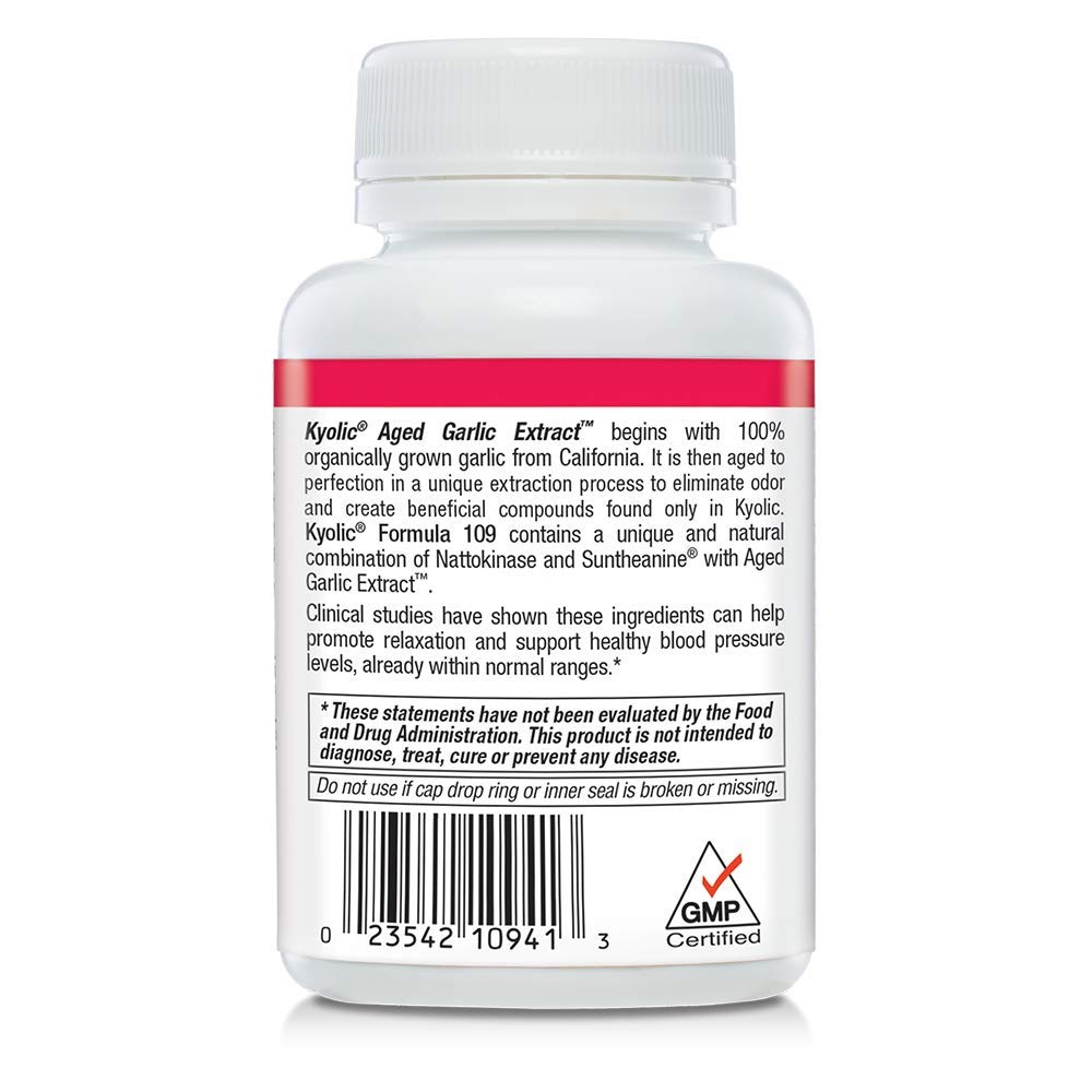 Formula 109 contains a unique, natural combination of Nattokinase and Suntheanine with Aged Garlic Extract to support healthy blood pressure levels, already within normal ranges. Kyolic Aged Garlic Extract (AGE) starts with organically grown garlic. It is then aged using a proprietary process which removes odor-causing compounds attributed to raw garlic and increases the bioavailable, beneficial compounds.