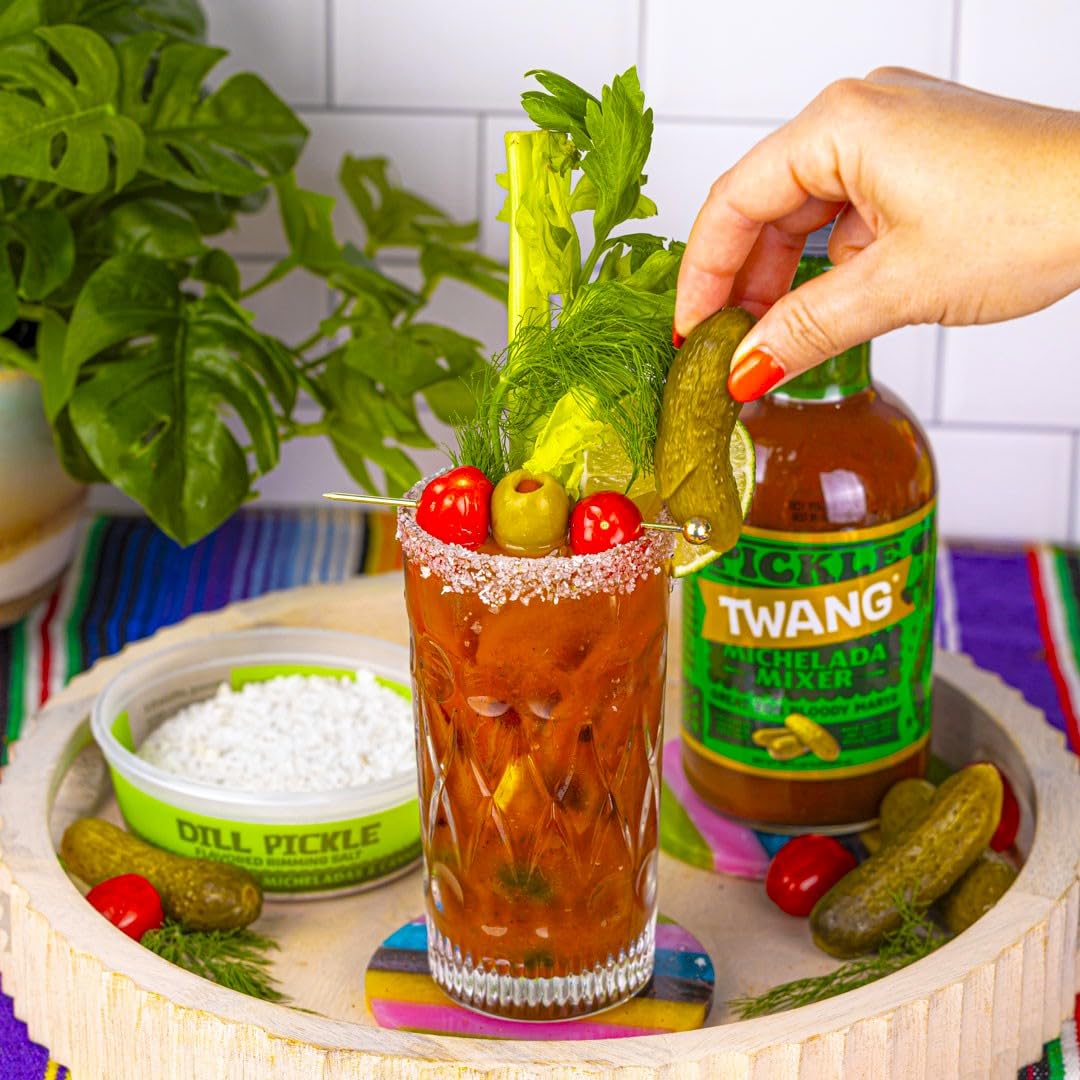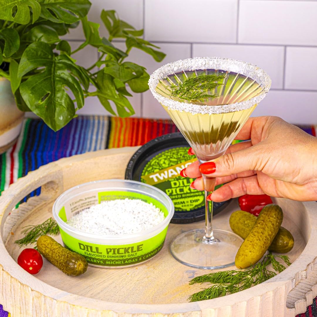 Experience the authentic flavor of Twang Dill Pickle Rimming Salt. Made with all natural ingredients, this unique blend is designed to elevate your favorite beverages with the distinctive flavor of dill pickle. Perfect for adding a tangy twist to your cocktails, this rimming salt brings a crisp and savory note that will enhance your drinking experience. Twang Dill Pickle Rimming Salt is ideal for rimming the glasses of Bloody Marys, micheladas, pickle martinis, or even pickleback shots. Simply rim your glass with Twang Dill Pickle Rimming Salt and enjoy the burst of authentic dill pickle flavor.