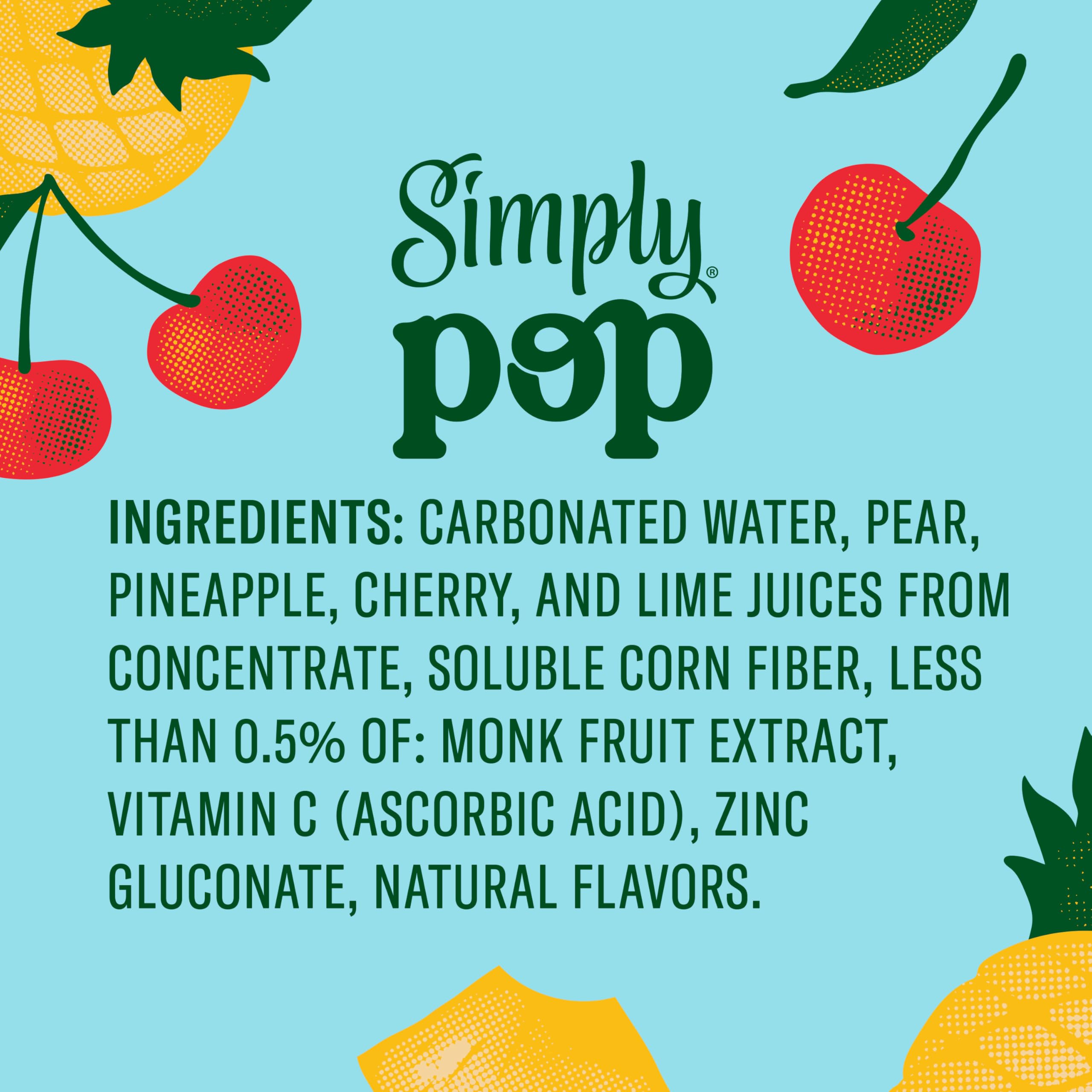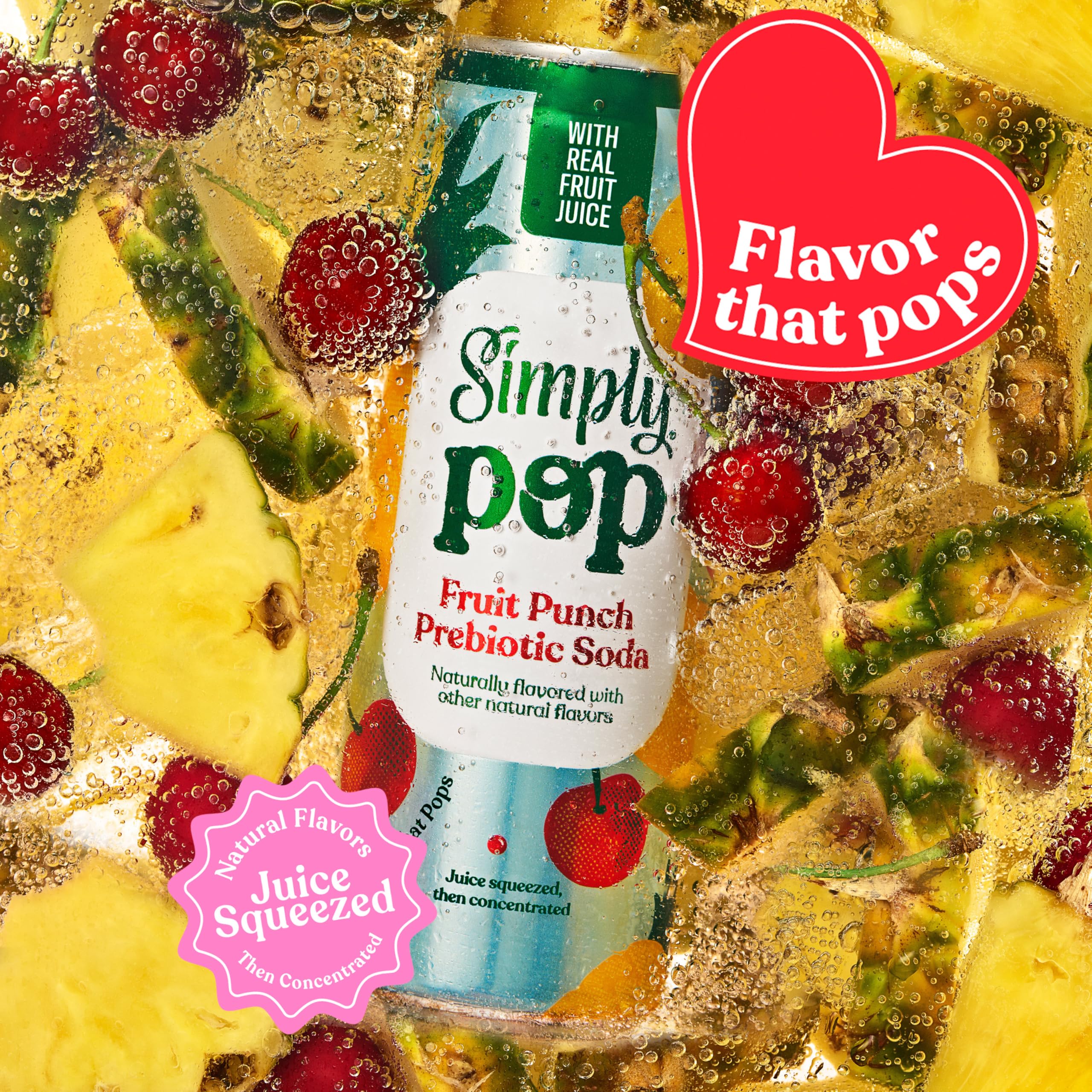 You’ve discovered it, the ultimate upgrade to your soda game. See what the fizz is all about with Simply Pop Fruit Punch Prebiotic Soda. Made with real fruit juice from concentrate for a delicious bubbly beverage full of juicy flavor that really pops! This fruity, fizzy, flavorful, prebiotic drink contains 6 grams of prebiotic fiber to support gut health, zinc and vitamin C to support immune health, no added sugar, additional ingredients and 50 calories per can. It's also non-GMO and sweetened with real fruit juice and monk fruit extract. All this and packed with flavor too –– you're gonna love 'em! With a variety of flavors available, there's a Simply prebiotic drink for everyone.