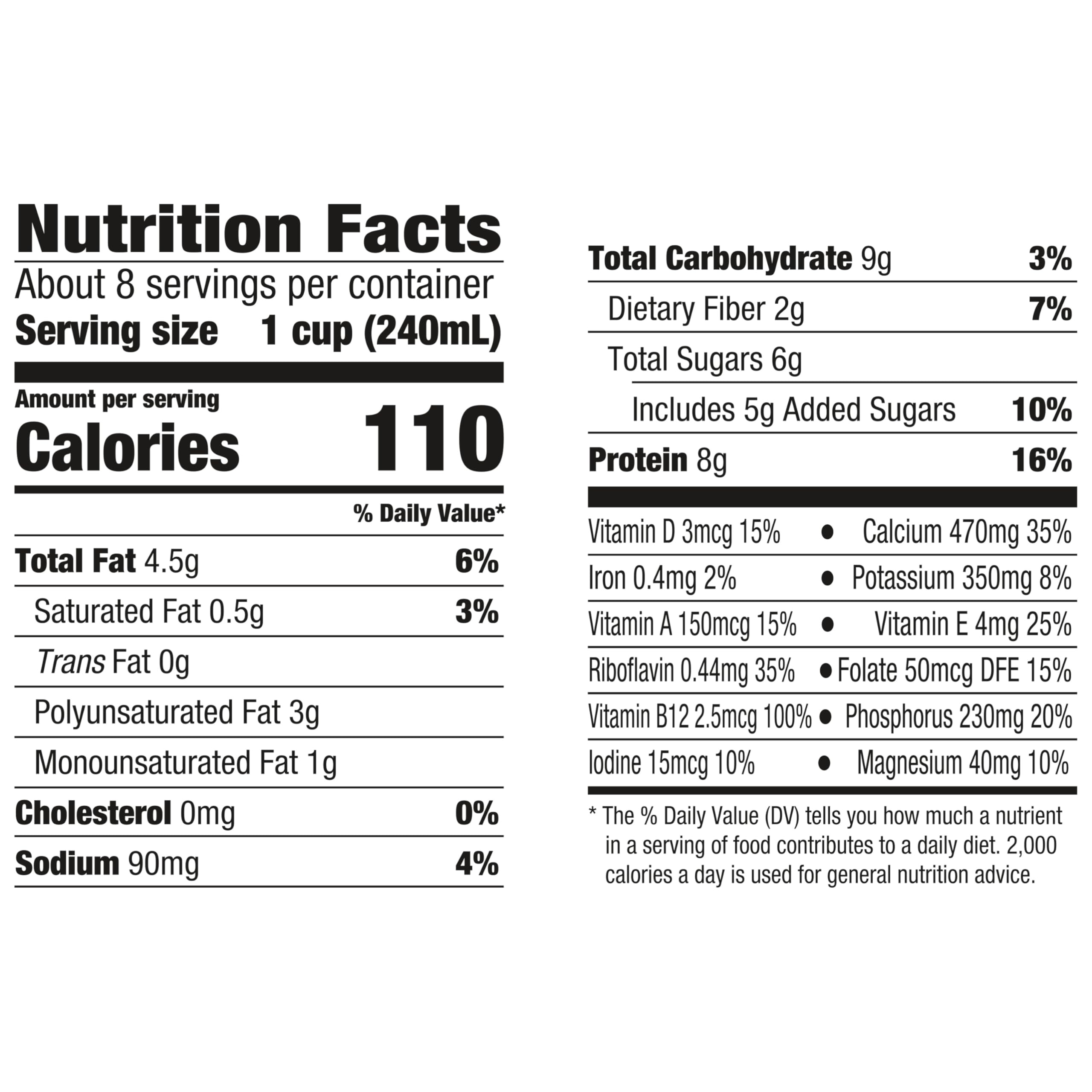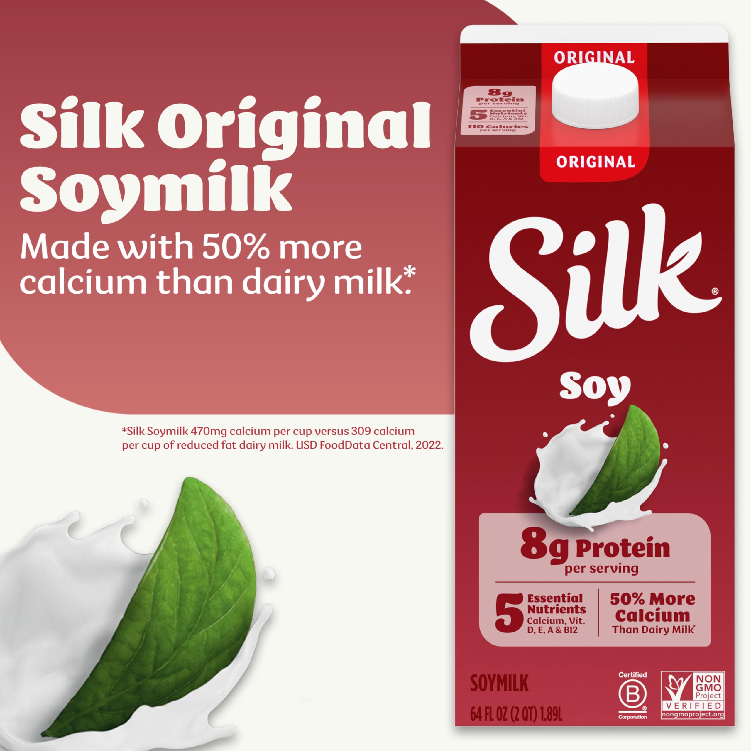Treat yourself with Silk Original Soymilk. Made with whole harvested soybeans grown by Mother Nature, this lactose free milk is the Original Nutrition Powerhouse. It's an extraordinary tasting plant based milk that you can use throughout your day. Every serving of this nondairy milk has 50% more calcium than dairy milk*, along with 8 grams of complete plant-based protein (16% DV). Silk Soymilk is totally free of dairy, gluten, carrageenan and cholesterol. Looking for lactose free cooking or baking supplies? Whether you’re making a healthy smoothie, making a bowl of tasty cereal or drinking straight out of a glass, trust Silk — the Original Plant Pioneer. Read more about our story on our packaging. Enjoy all of the Silk products, including vegan milk, non dairy creamer and dairy free yogurt varieties. *Silk Original Soymilk: 470mg calcium per cup; reduced fat dairy milk: 309mg calcium per cup. USDA, ARS. FoodData Central, 2022.
