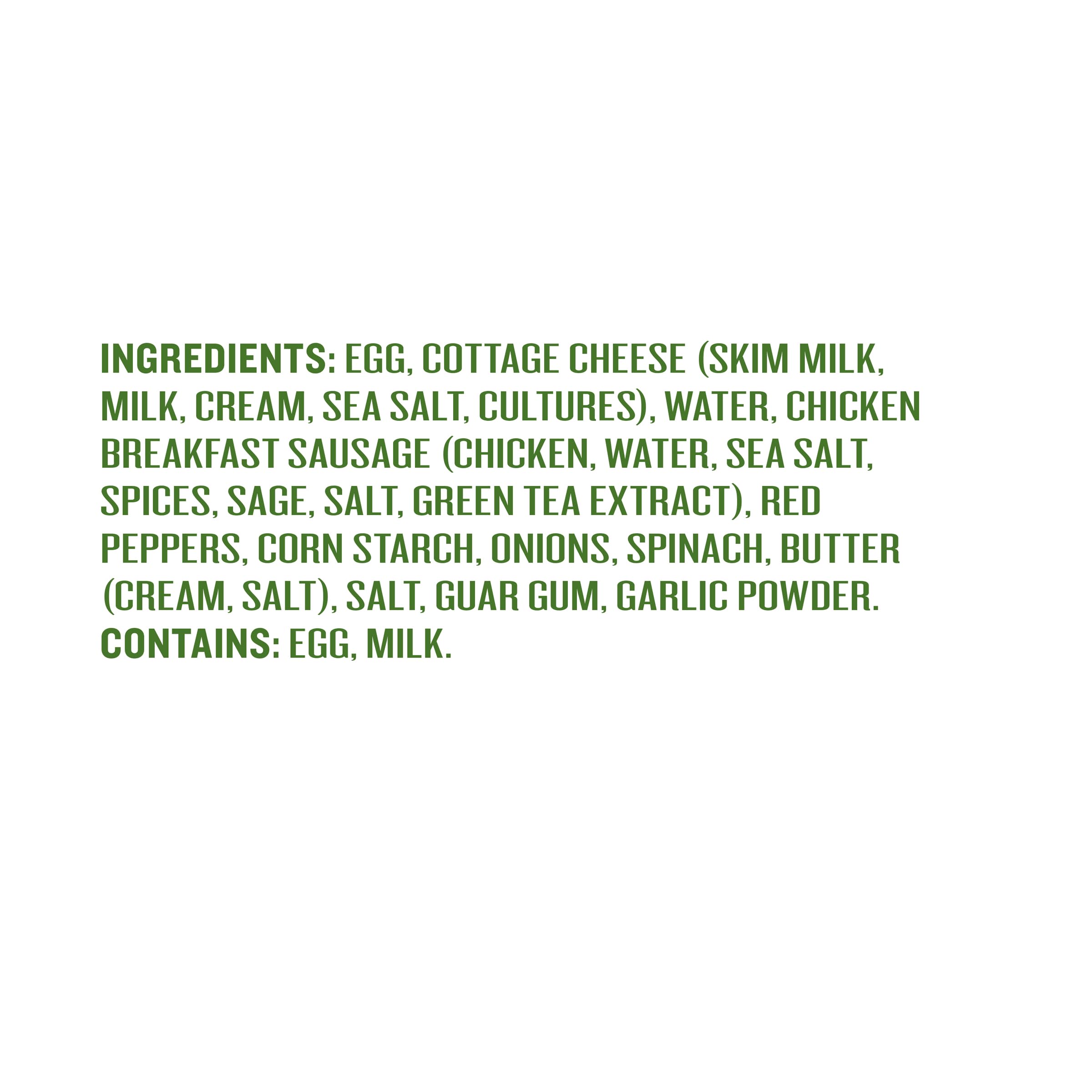 No time for an omelet, no problem! Our chicken sausage frittata bites are packed with everything you need including the mild sweet taste of red pepper, crisp onion and hearty spinach. Trust us you won’t meat a better frittata. 100% natural (minimally processed, no artificial ingredients). Fully cooked. Ready to heat. Microwavable. We sourced from farms where animals are raised with care and respect (chicken raised on vegetarian feed and environmental enrichments to promote natural behaviors and well-being). We believe this leads to great tasting products and peach of mind - all part of our mission. Changing the meat we eat. Chicken raised with no antibiotics ever (Chicken never administered antibiotics, added growth hormones, or fed animal by-products. Federal regulations prohibit the use of added hormones in poultry). Please recycle.