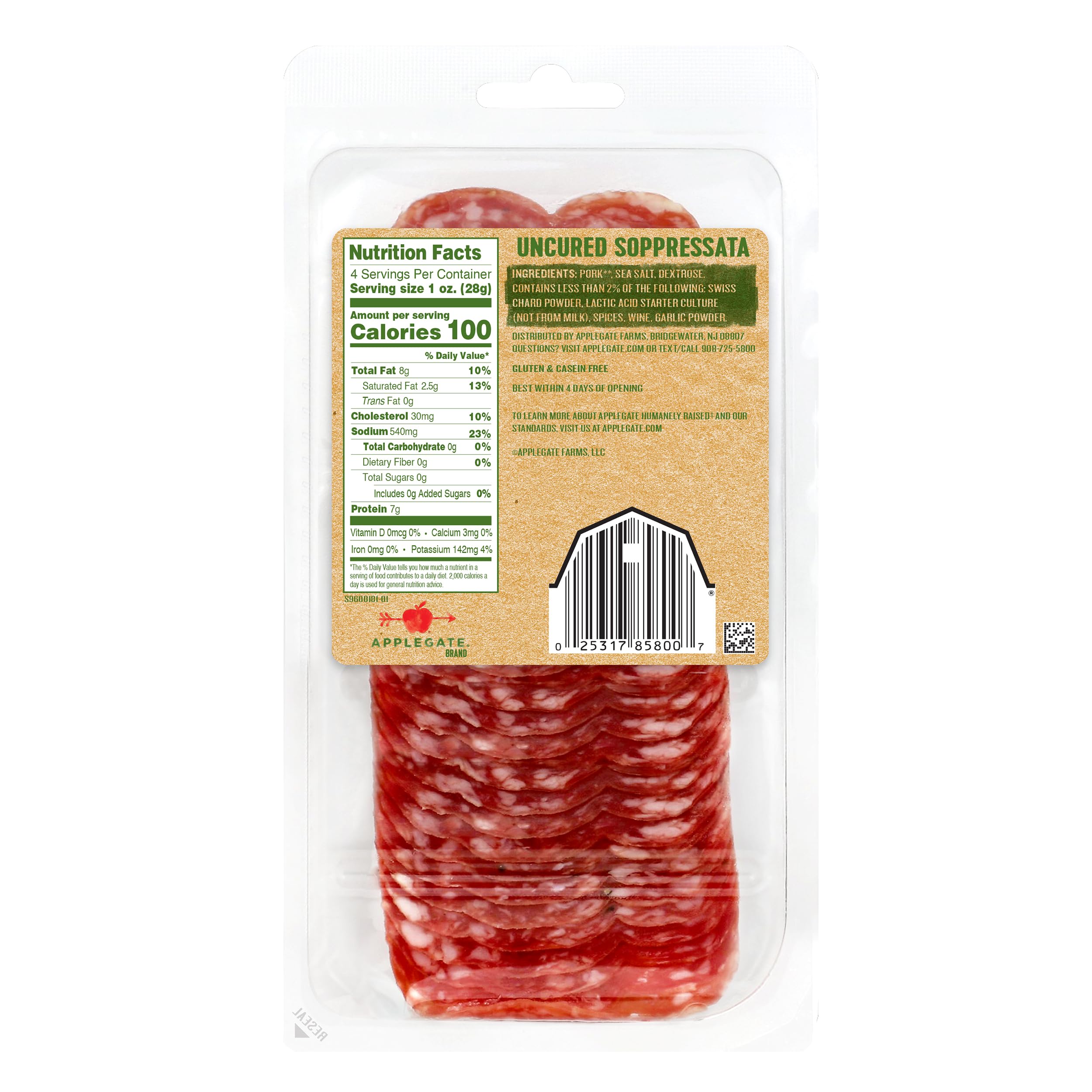 Applegate Natural Uncured Soppressata is delicately seasoned with pepper and garlic. Then, we dry-cure for nearly two months. How you enjoy our natural soppressata salami is up to you. We source from family farms, where animals are raised with care and respect. We believe this leads to great tasting products and peace of mind-- all part of our mission. Changing The Meat We Eat. Fully Cooked. Ready to eat. Gluten & casein free. Naturals (Minimally processed, no artificial ingredients). No antibiotics ever (Pork never administered antibiotics or animal by products). Applegate humanely raised (Pork raised with no crates ever on family farms on vegetarian feed and no ractopamine [a beta-against growth promotant]). No nitrates or nitrites added except those naturally occurring in sea salt and Swiss chard powder. U.S. inspected and passed by Department of Agriculture.