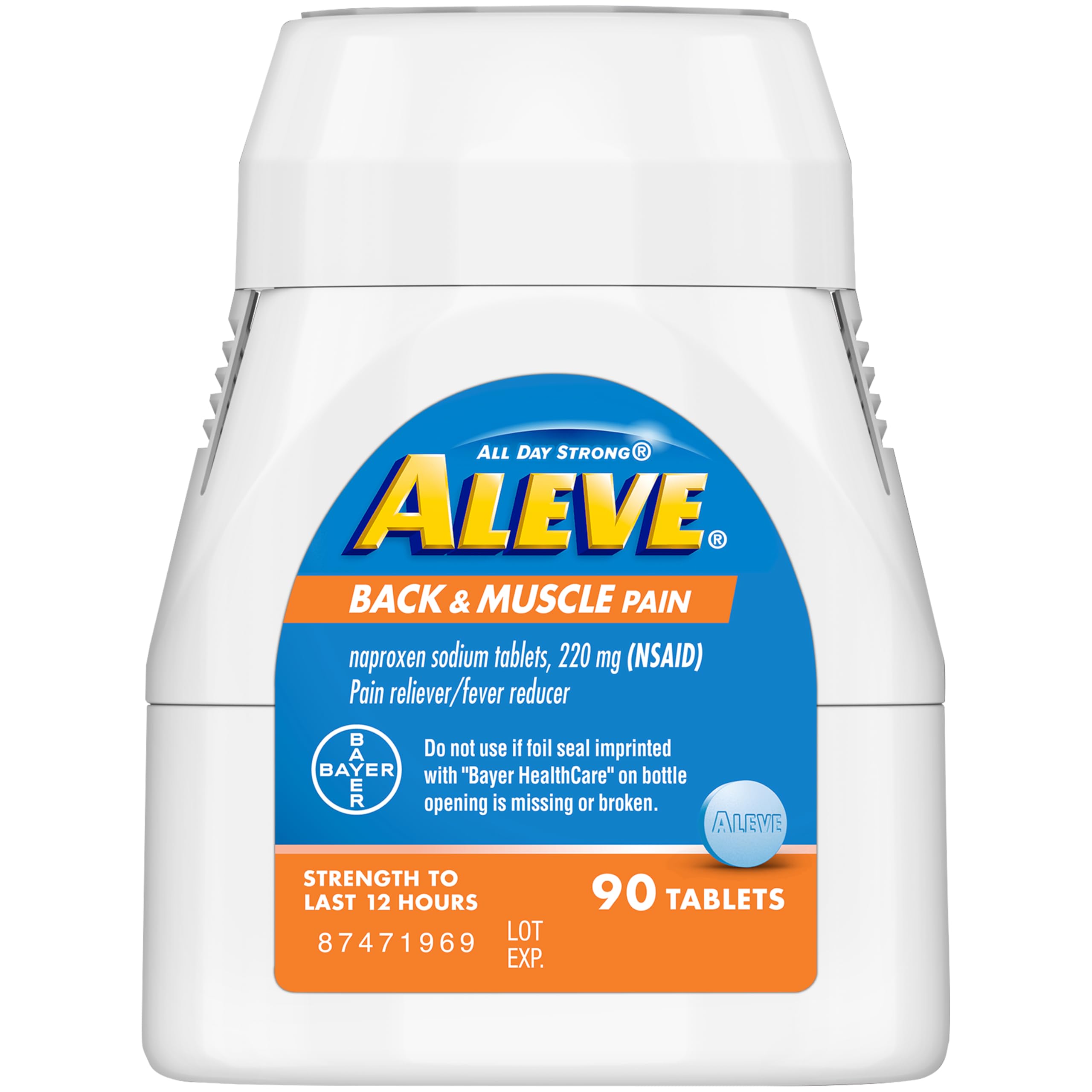 Aleve Back and Muscle Pain Relief Naproxen Sodium Tablets provide targeted muscle and back pain relief. Each Naproxen Sodium 220 mg tablet has the strength to deliver up to 12 hours of effective back and muscle pain relief. Aleve is formulated to manage minor pain from a backache and other minor muscle aches and pains. Available in small, round tablet form, these back and muscle pain relief pills are easy to swallow and come in a convenient child‐resistant bottle. Pain happens. Aleve it.