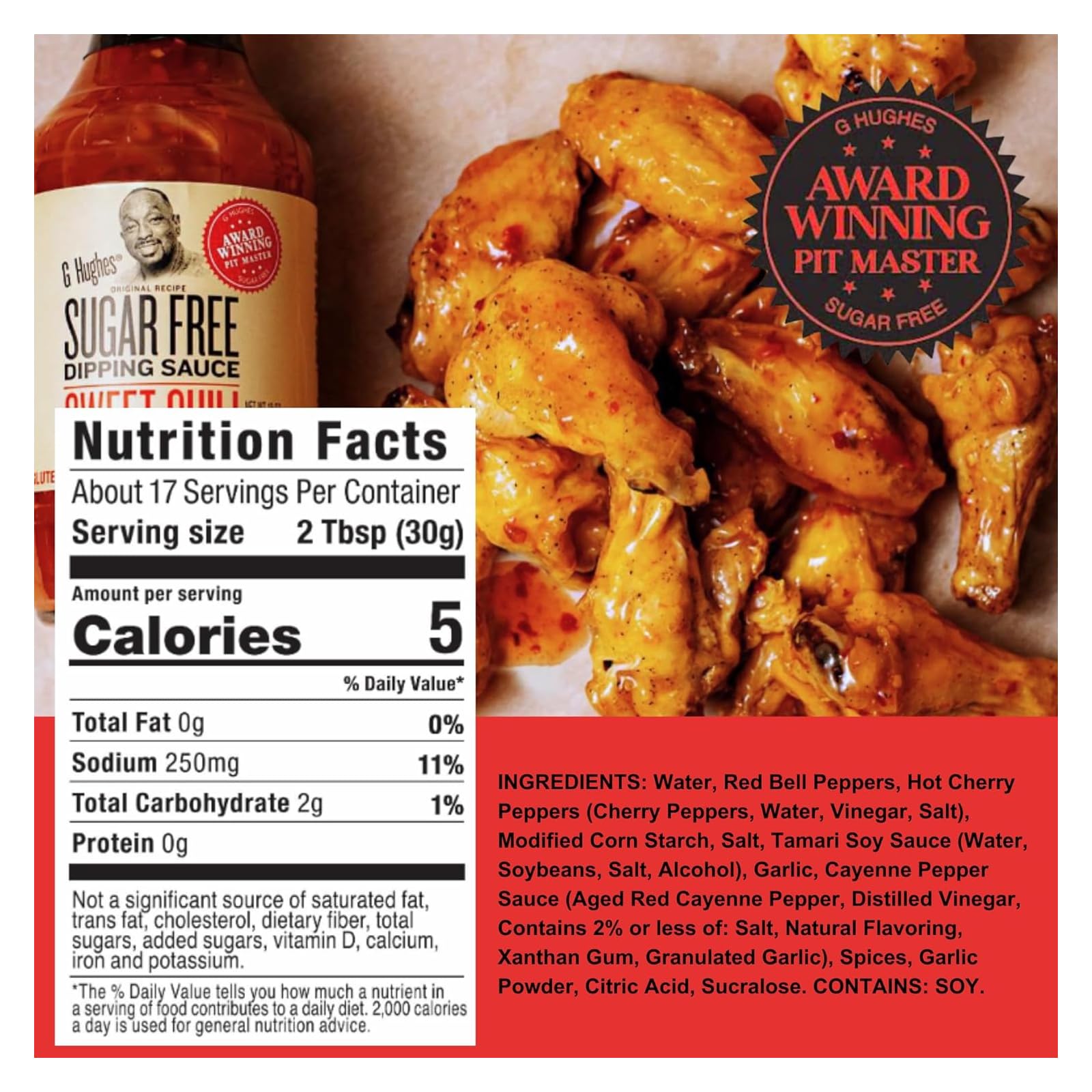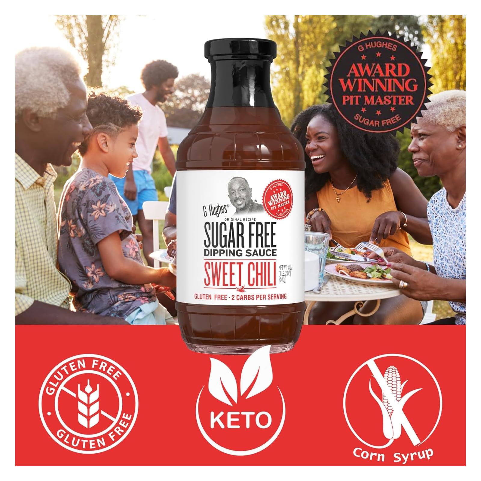 Only 2 carbs per serving. Sugar free. Always sugar free + Certified gluten free. gfco.org. A low calorie food. Original recipe. G Hughes is proud to present a completely new addition to his family of signature sauces, sweet chili! GHugheSugarFree.com. Instagram: Follow us on Instagram. Facebook: Like us on facebook. (at)ghughessugarfree. G Hughes Sugar Free - Award Winning Pit Master. Produced at Summer Garden Food, A green LEED Certified Facility.