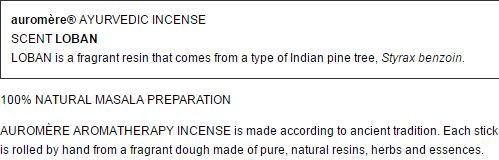 Auromere Ayurvedic Incense features Loban, a fragrant resin that is derived from Styrax benzoin , a pine tree native to India. Auromere Ayurvedic Incense sticks are made from natural resins, herbs and essences, and they are hand rolled in accordance to ancient traditions.