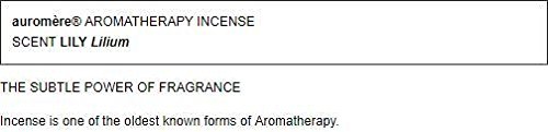 Aromatherapy Incense Lily 10gm 12 Pack from AuromereIncense is one of the oldest forms of Aromatherapy that uses the subtle power of fragrances to re-establish balance and harmony in the body and in the many levels of our being. The Aromatherapy incense re-establishs balance and harmony in the 3 doshas (or 3 humours): Vata, Patta & Kapha.Lily (Lilium) is gently sedative and soothing, calms the heart, nerves and emotions. Helpful for irritability, anxiety, and insomnia. Prevents negative dreams, reduces worries and agitation. Stimulates the heart center, increasing faith, devotion and virtue. Lowers Pitta and Vata, increases Kapha.Ingredients:Fine essential oils, fragrant herbs, powders and resin.Aromatherapy Incense Lily 10gm 12 Pack from AuromereUPC: 27275500196