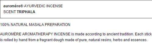 Triphala, or "3 fruits" in Sanskrit is a well-known Ayurvedic rejuvenative compound prized for its harmonizing effect on the 3 doshas. Of the ingredients: Haritaki is rejuvenative for Vata dosha, Amalaki for Pitta dosha, and Bibhitoki for Kapha dosha. Auromere Ayurvedic Incense is made according to ancient tradition. Each stick is rolled by hand from a fragrant dough made of pure, natural resins, herbs and essences. The ingredients have been used for thousands of years in the practice of "Ayurveda," the ancient, holistic science of India which aims at a total harmony of Mind, Life, Body, and Spirit.