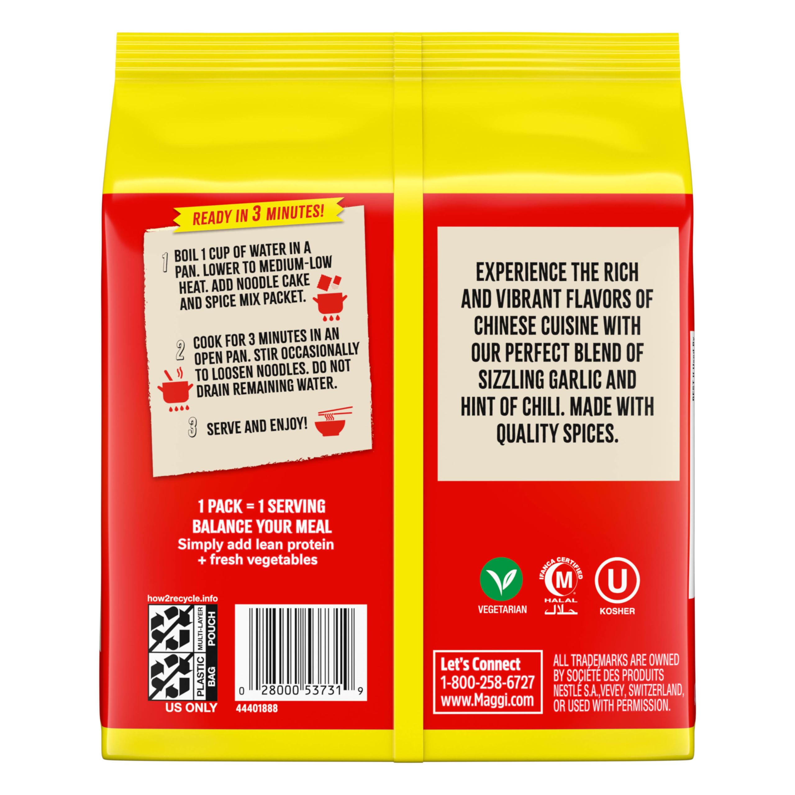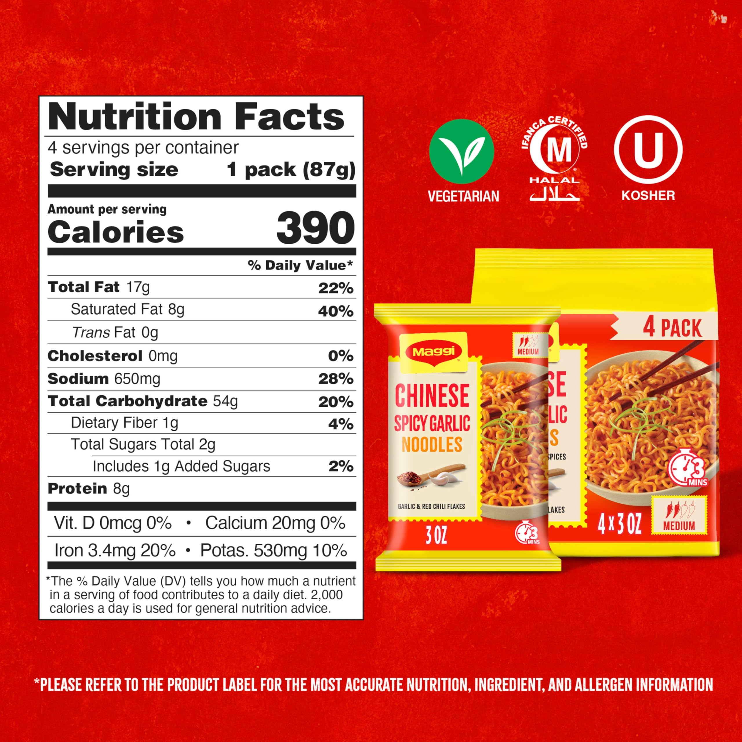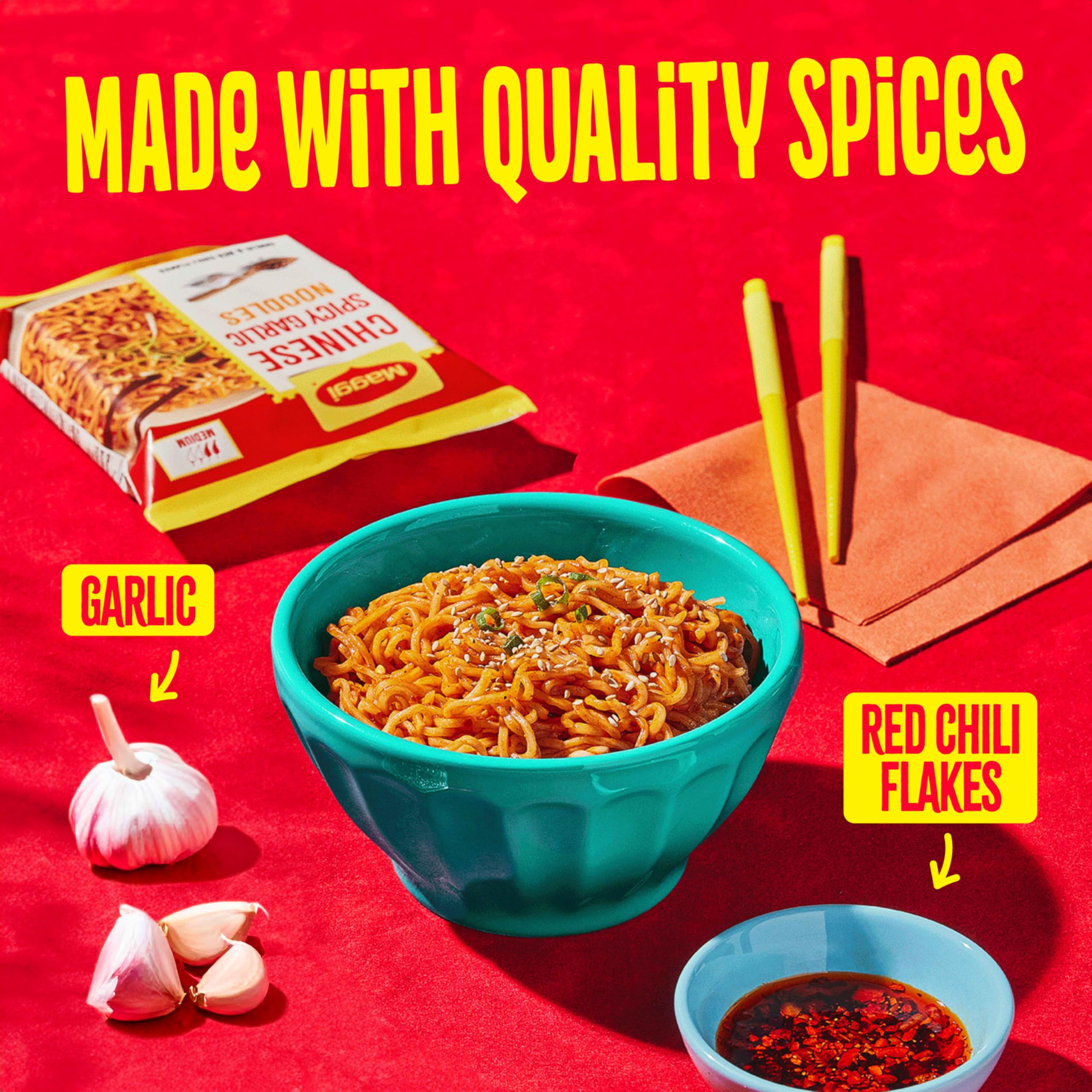 Maggi Chinese Spicy Garlic Noodles, Instant Ramen Noodles, 3 min, Vegetarian, Halal, Kosher, 4-Pack