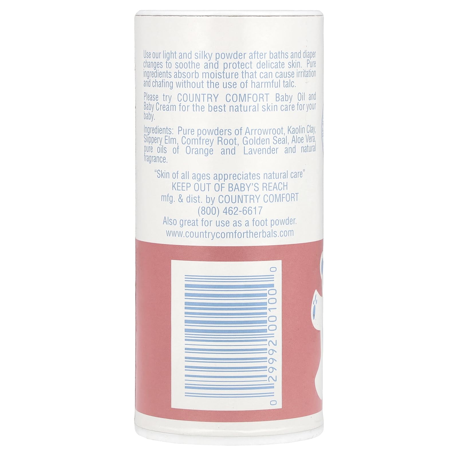 Country Comfort Pure and natural herbal baby bowder, no talc, pure and natural. Herbal baby powder. No talc or fillers. Cruelty free. Country Comfort Baby powder is very absorbent and non-abrasive. The gentle healing properties of five herbal powders are combined with the fragrant subtle scents of pure orange and lavender Oils. These pure ingredients absorb moisture than can cause irritation and chafing, without the use of harmful talc. It is packaged in a three Ounce non-breakable reusable shake top container.