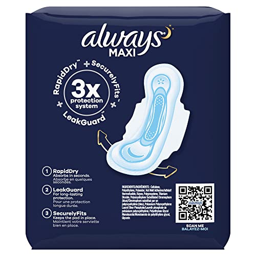 GET UP TO 100% LEAK FREE COMFORT with Always Maxi 45% MORE BACK COVERAGE than an Always Maxi Regular Size HAVE A PERFECT NIGHT SLEEP with Always Night Pads GET ULTIMATE PROTECTION with a thicker core WICKS AWAY GUSHES quickly with its RapidDRY Technology