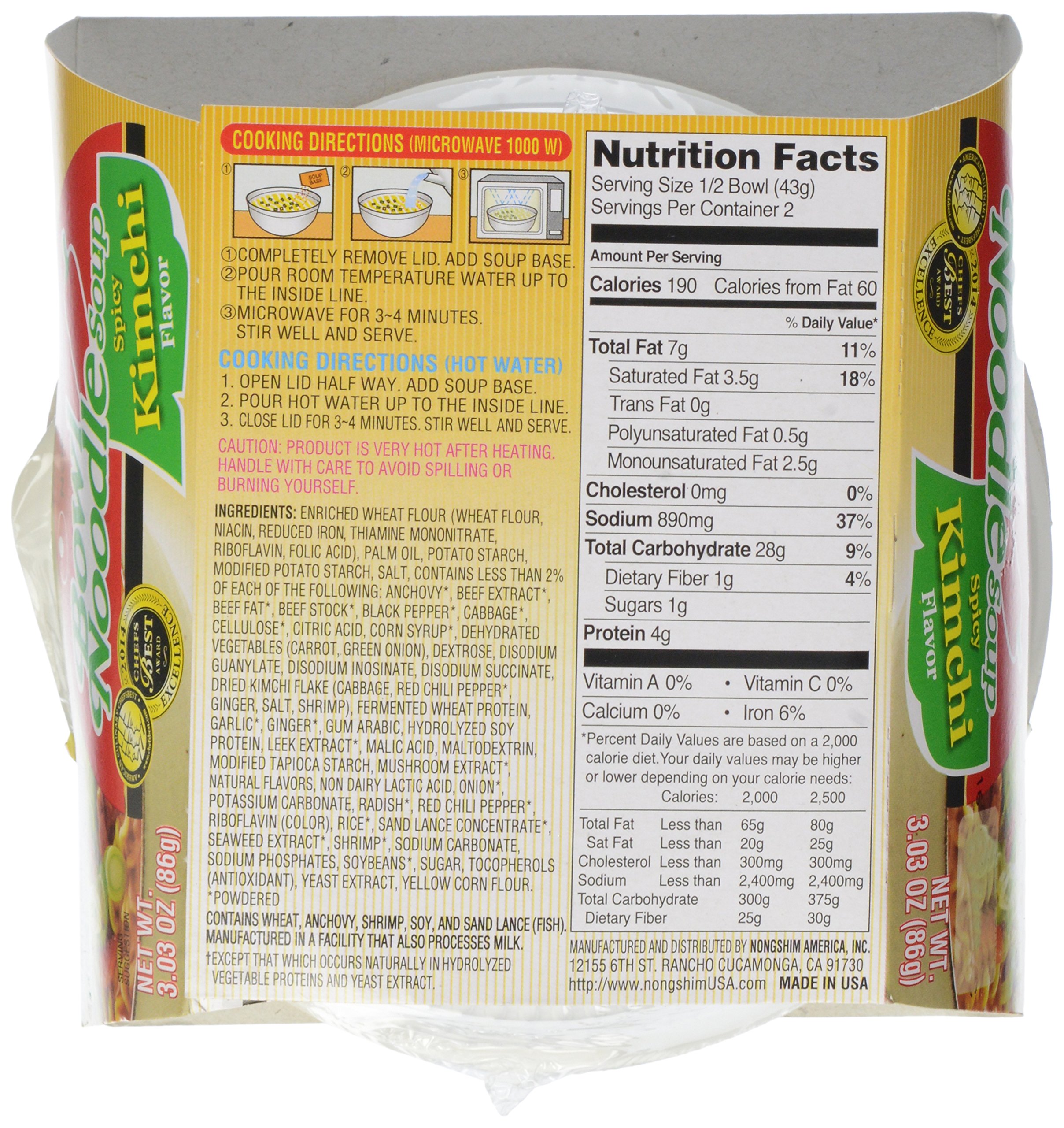 With this kimchi-flavored, Korean-style ramen from Nong Shim, you don't have to sacrifice taste for speed. The soup offers a fresh, spicy flavor and features fried kimchi to reproduce the taste of authentic kimchi stew. Other tasty ingredients include high-grade noodles, mogi mushrooms, and pak choi. Preparing the soup is easy. Simply open the lid partway, add the soup base, add boiling water, and wait for three minutes--then stir and enjoy. The soup contains no trans fats. Nong Shim won a 2006 "Best Taste" award from ChefsBest, an independent judging organization dedicated to recognizing and honoring America's best food. Included are 12 bowls of Nong Shim noodle soup. Each serving weighs 3.03 ounces. This product is made in the United States.