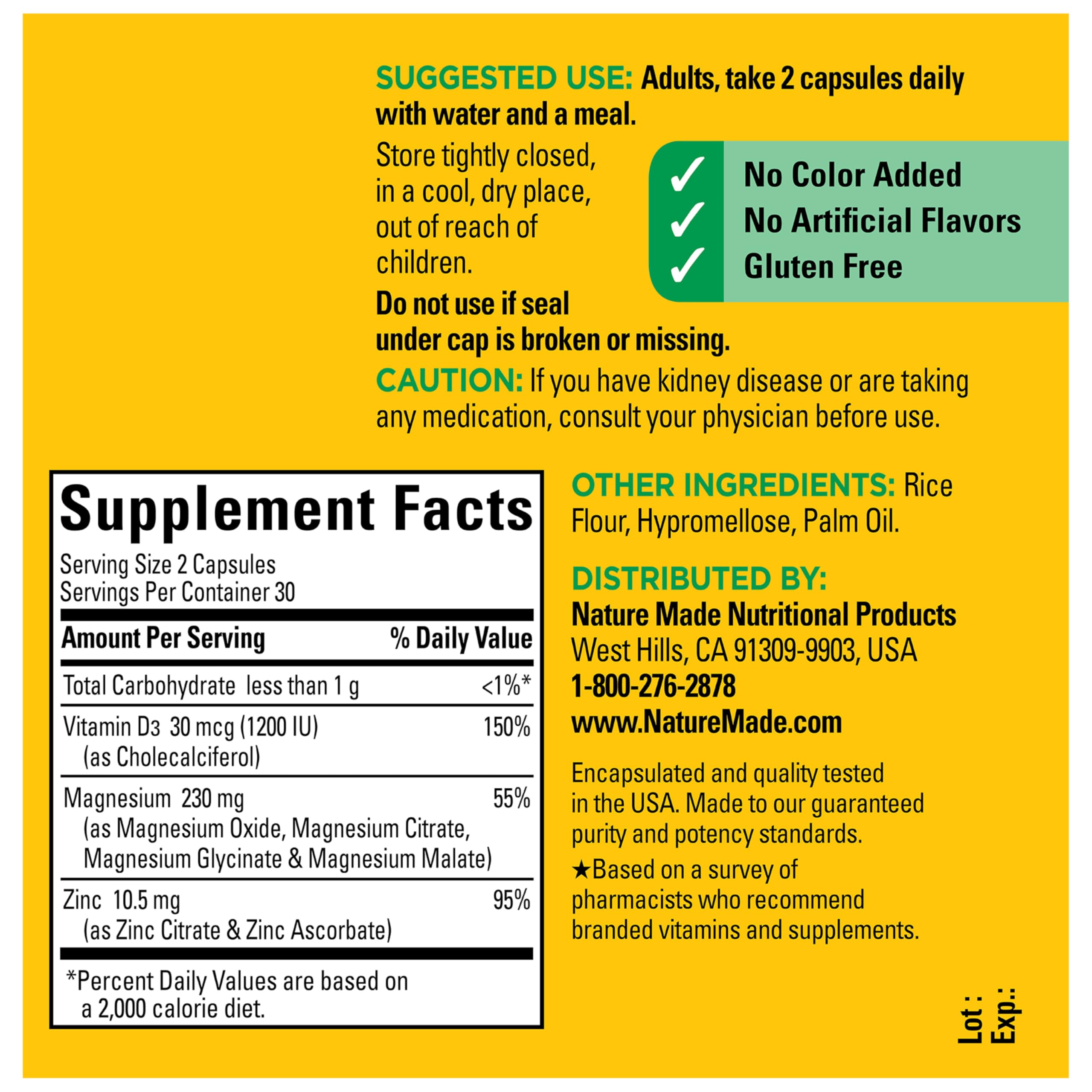 Nature Made Magnesium Complex with Vitamin D3 and Zinc provides 230 mg of a 4-in-1 Magnesium blend to support muscle relaxation, heart health, nerve health, and bone health in two daily capsules. These Magnesium capsules also provide Vit D3 1200 IU (30 mcg) and Zinc 10.5 mg per serving to support a healthy immune system. This Magnesium supplement has a 4-in-1 blend of Magnesium Citrate, Magnesium Glycinate, Magnesium Oxide, and Magnesium Malate to help relax the body. These Magnesium supplements have no color added, no artificial flavors, and are gluten free. Adults, take two capsules daily with water and a meal. Magnesium Nature Made supplements offer an easy way to provide magnesium for men and women as part of their daily wellness routine. Start your day with Nature Made Magnesium, Vitamin D and Zinc supplements. *Based on a 2024 survey of pharmacists who recommend branded vitamins and supplements.