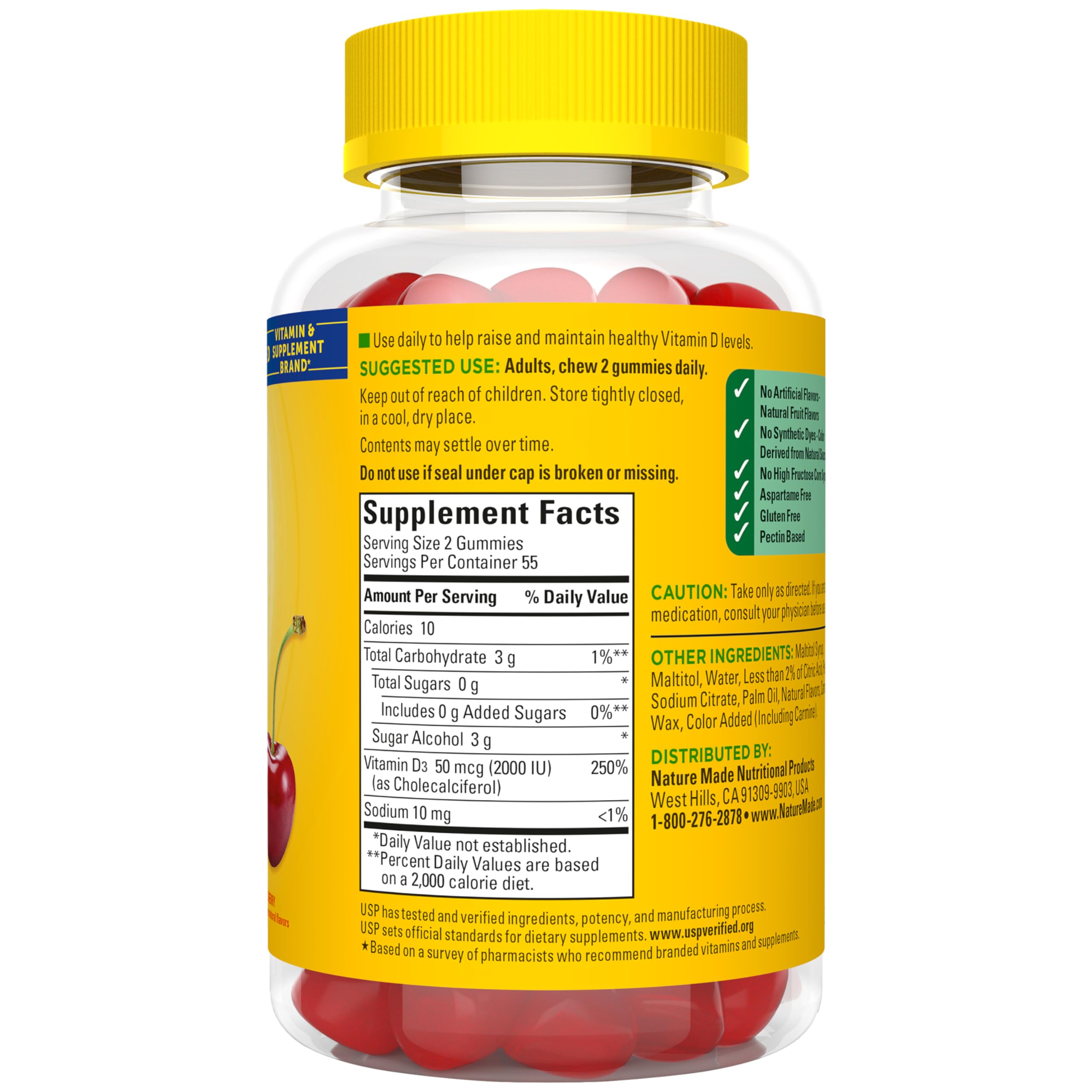 The gummies you love now with zero sugar!(1) Nature Made Zero Sugar(1) Vitamin D3 Gummies for adults provide Vitamin D 2000 IU (50 mcg) per serving. D3 Vitamin is an essential nutrient that supports immune, bone, teeth and muscle health. These Vitamin D gummies for women and men are pectin based, gluten free and aspartame free with no artificial flavors, no high fructose corn syrup and no synthetic dyes – color derived from natural source. Best of all, our sugar free Vitamin D gummies for adults have no sugar(1) and come in a tasty cherry with other natural flavors. Adults, chew 2 gummies daily. Start your day with sugar free Vitamin D supplements (1) from Nature Made. USP has tested and verified ingredients, potency and manufacturing process. USP sets official standards for dietary supplements. Visit the USP verified website for more information. (1)Not a low calorie food. *Based on a 2022 survey of pharmacists who recommend branded vitamins and supplements. These statements have not been evaluated by the Food and Drug Administration. This product is not intended to diagnose, treat, cure, or prevent any disease.